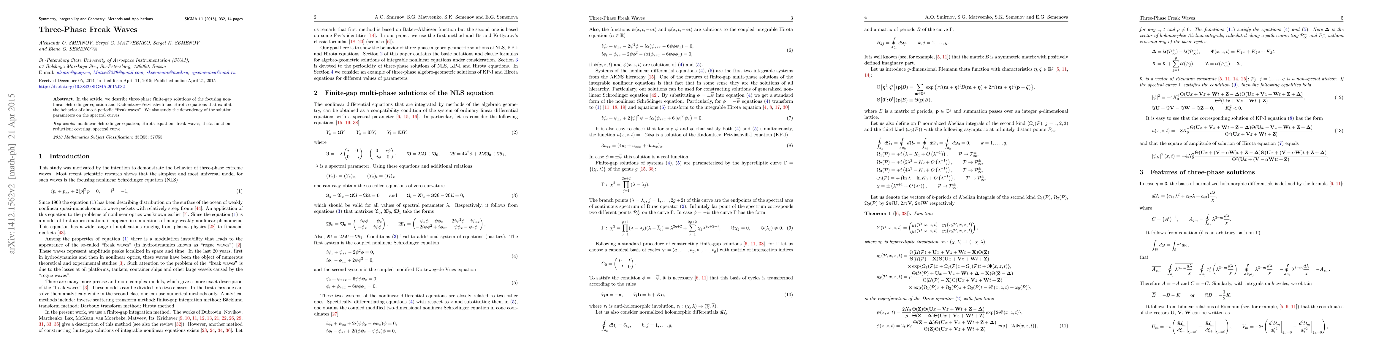 In the article, we describe three-phase finite-gap solutions of the focusing nonlinear Schr\"odinger equation and Kadomtsev-Petviashvili and Hirota equations that exhibit the behavior of almost-periodic "freak waves". We also study the dependency of the solution parameters on the spectral curves.