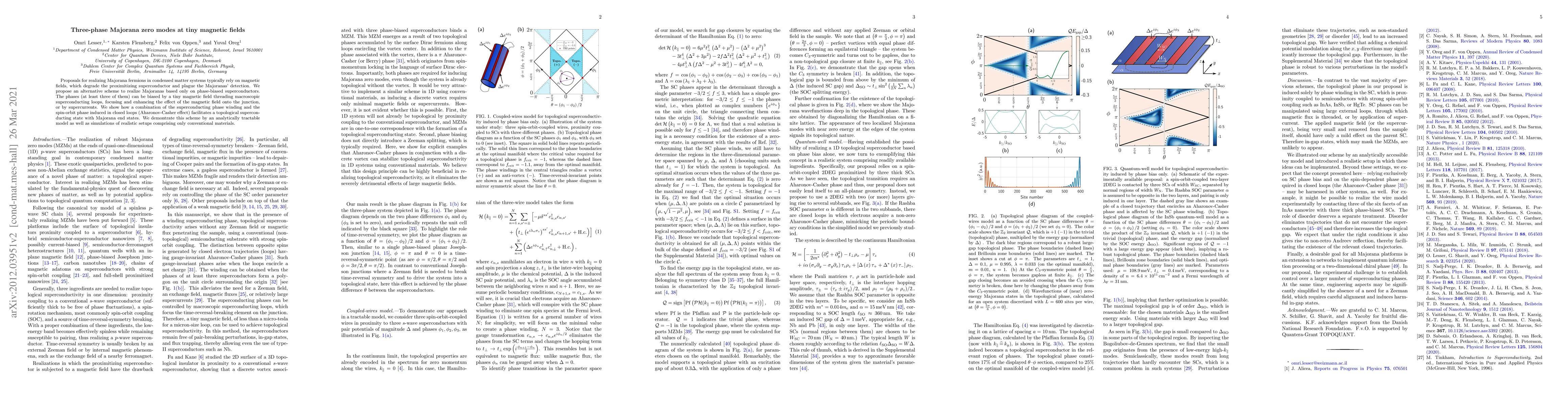 Proposals for realizing Majorana fermions in condensed matter systems typically rely on magnetic fields, which degrade the proximitizing superconductor and plague the Majoranas' detection. We propose an alternative scheme to realize Majoranas based only on phase-biased superconductors. The phases (at least three of them) can be biased by a tiny magnetic field threading macroscopic superconducting loops, focusing and enhancing the effect of the magnetic field onto the junction, or by supercurrents. We show how a combination of the superconducting phase winding and the spin-orbit phase induced in closed loops (Aharonov-Casher effect) facilitates a topological superconducting state with Majorana end states. We demontrate this scheme by an analytically tractable model as well as simulations of realistic setups comprising only conventional materials.