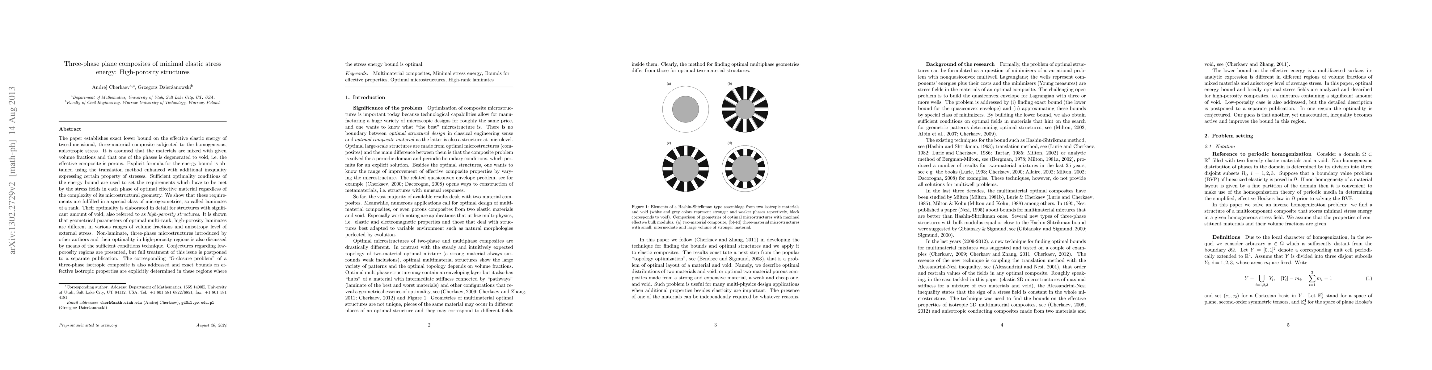 The paper establishes an exact lower bound for the effective elastic energy of a two-dimensional, three-material composite with high porosity, using a translation method and additional inequality. It identifies optimal microgeometries, specifically multi-rank laminates, that meet the requirements for minimal stress energy in high-porosity structures, with varying geometrical parameters based on volume fractions and stress anisotropy.