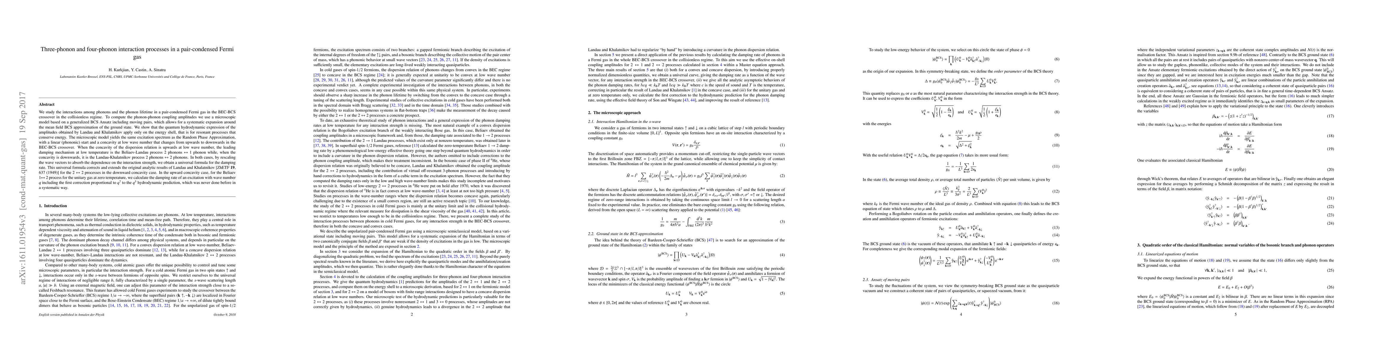 We study the interactions among phonons and the phonon lifetime in a pair-condensed Fermi gas in the BEC-BCS crossover in the collisionless regime. To compute the phonon-phonon coupling amplitudes we use a microscopic model based on a generalized BCS Ansatz including moving pairs, which allows for a systematic expansion around the mean field BCS approximation of the ground state. We show that the quantum hydrodynamic expression of the amplitudes obtained by Landau and Khalatnikov apply only on the energy shell, that is for resonant processes that conserve energy. The microscopic model yields the same excitation spectrum as the Random Phase Approximation, with a linear (phononic) start and a concavity at low wave number that changes from upwards to downwards in the BEC-BCS crossover. When the concavity of the dispersion relation is upwards at low wave number, the leading damping mechanism at low temperature is the Beliaev-Landau process 2 phonons $\leftrightarrow$ 1 phonon while, when the concavity is downwards, it is the Landau-Khalatnikov process 2 phonons $\leftrightarrow$ 2 phonons. In both cases, by rescaling the wave vectors to absorb the dependence on the interaction strength, we obtain a universal formula for the damping rate. This universal formula corrects and extends the original analytic results of Landau and Khalatnikov [ZhETF {\bf 19}, 637 (1949)] for the $2\leftrightarrow2$ processes in the downward concavity case. In the upward concavity case, for the Beliaev 1$\leftrightarrow$ 2 process for the unitary gas at zero temperature, we calculate the damping rate of an excitation with wave number $q$ including the first correction proportional to $q^7$ to the $q^5$ hydrodynamic prediction, which was never done before in a systematic way.