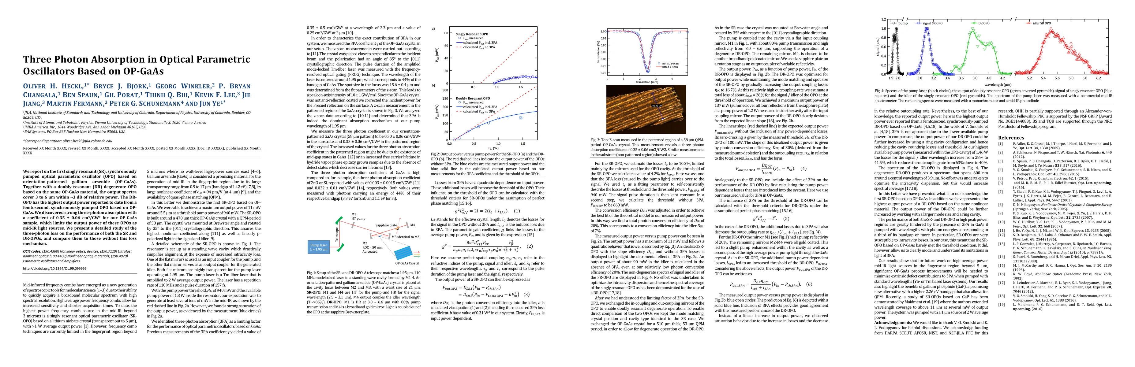 We report on the first singly-resonant (SR), synchronously pumped optical parametric oscillator (OPO) based on orientation-patterned gallium arsenide (OP-GaAs). Together with a doubly resonant (DR) degenerate OPO based on the same OP-GaAs material, the output spectra cover 3 to 6 ${\mu}$m within ~3 dB of relative power. The DR-OPO has the highest output power reported to date from a femtosecond, synchronously pumped OPO based on OP-GaAs. We discovered strong three photon absorption with a coefficient of 0.35 ${\pm}$ 0.06 cm${^3}$/GW${^2}$ for our OP-GaAs sample, which limits the output power of these OPOs as mid-IR light sources. We present a detailed study of the three photon loss on the performance of both the SR and DR-OPOs, and compare them to those without this loss mechanism.