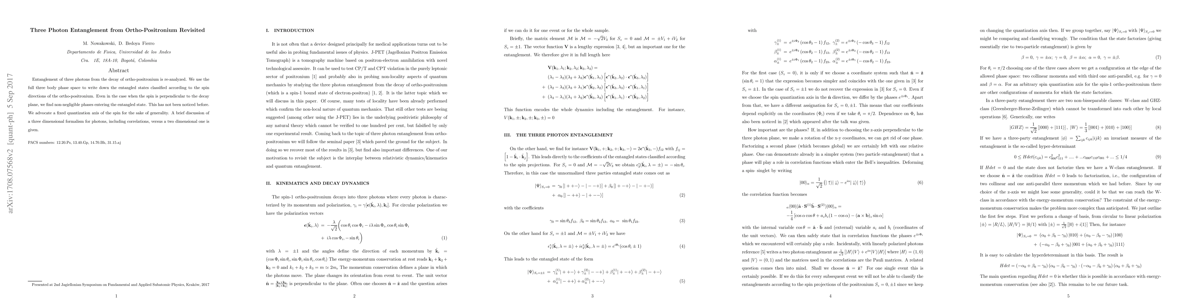 This paper re-analyzes the entanglement of three photons from ortho-positronium decay, revealing non-negligible phases in the entangled states, even when the spin is perpendicular to the decay plane. The authors advocate for a fixed quantization axis and discuss the implications of a three-dimensional versus a two-dimensional formalism for photon correlations.