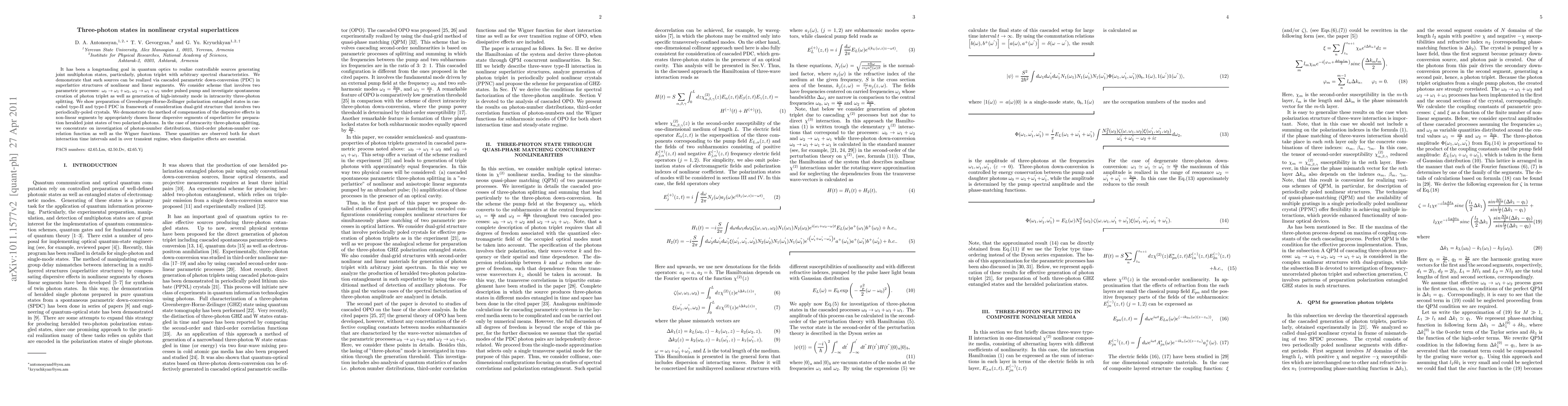 This paper demonstrates the generation of controllable three-photon states via cascaded parametric down-conversion in superlattice structures, achieving high-intensity modes and polarization entangled states, while also addressing dispersive effects through linear segments. It investigates photon-number distributions and correlation functions in intracavity three-photon splitting.