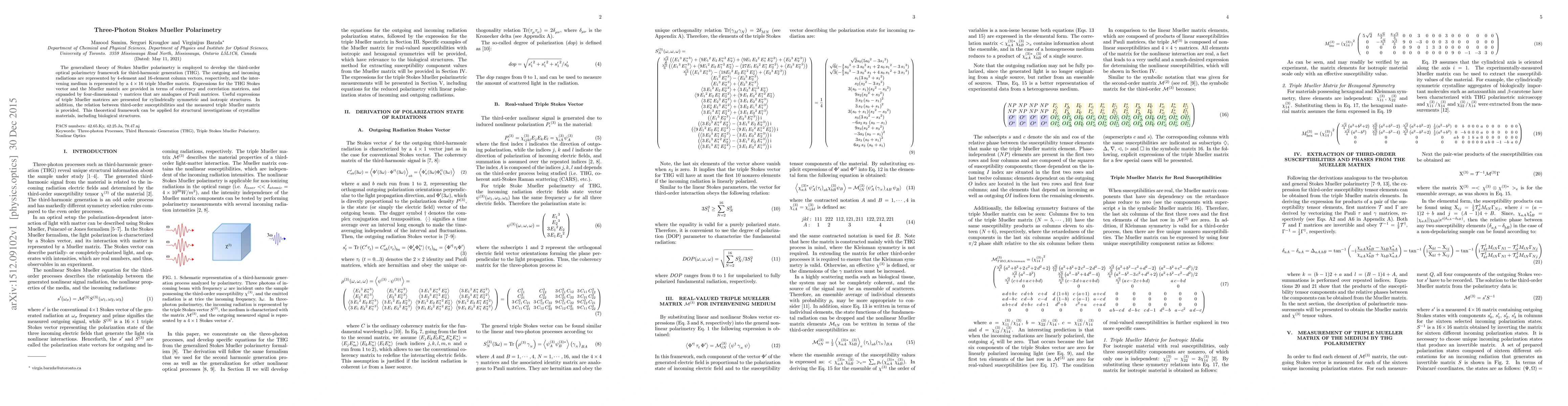 This paper develops a third-order optical polarimetry framework for third-harmonic generation using generalized Stokes Mueller polarimetry, introducing a $4\times 16$ triple Mueller matrix and providing expressions for the THG Stokes vector and Mueller matrix. The framework is applicable for structural investigations of crystalline and biological materials.
