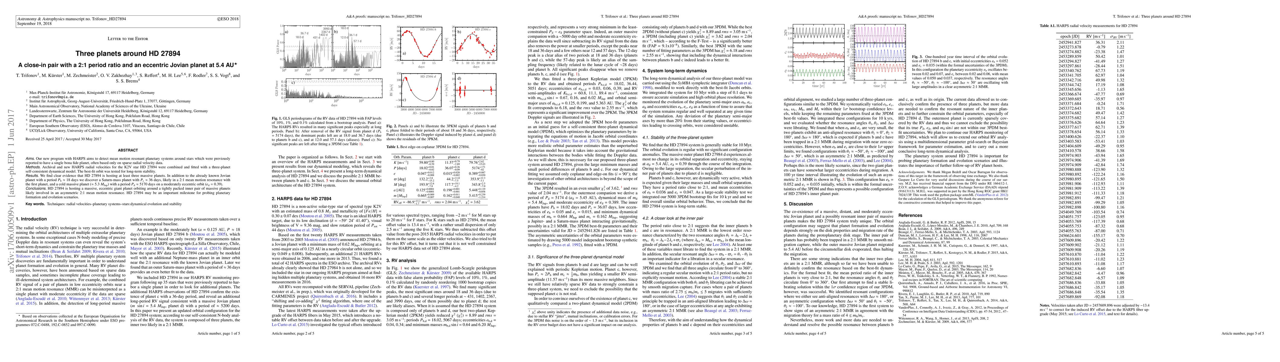 This study reveals three planets orbiting HD 27894, including a close-in pair in a 2:1 mean motion resonance and a distant eccentric Jovian planet. The findings suggest complex dynamical interactions and provide insights into planetary formation and evolution.