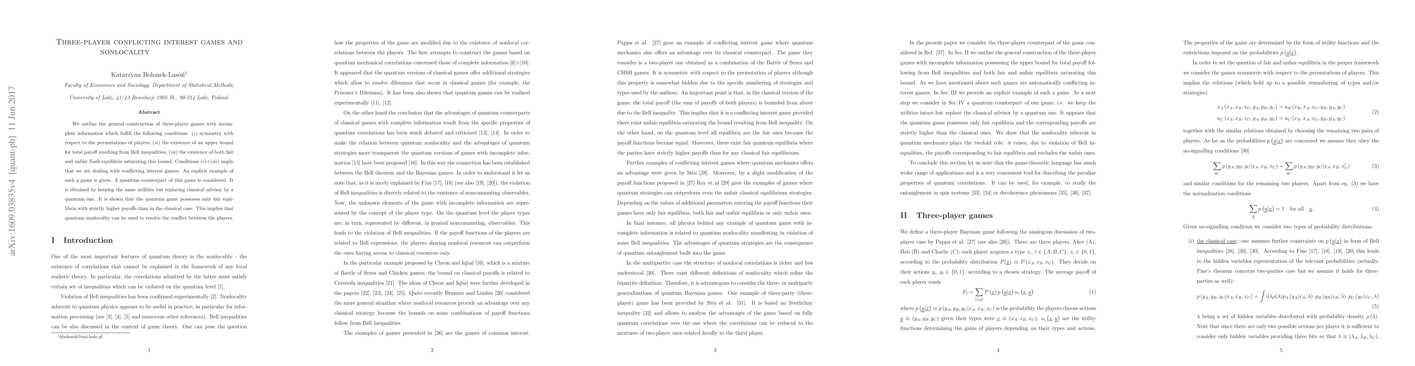 We outline the general construction of three-players games with incomplete information which fulfil the following conditions: (i) symmetry with respect to the exchange of the players; (ii) the existence of the upper bound for total payoff resulting from Bell inequalities; (iii) the existence of both fair and unfair Nash equilibria saturating this bound. Conditions (i)$\div$(iii) imply that we are dealing with conflicting interest games. An explicit example of such a game is given. A quantum counterpart of this game is considered which is obtained by keeping the same utilities but replacing classical advisor by a quantum one. It is shown that the quantum game possesses only fair equilibria with strictly higher payoffs than in the classical case. This implies that quantum nonlocality can be used to resolve a conflict between players.