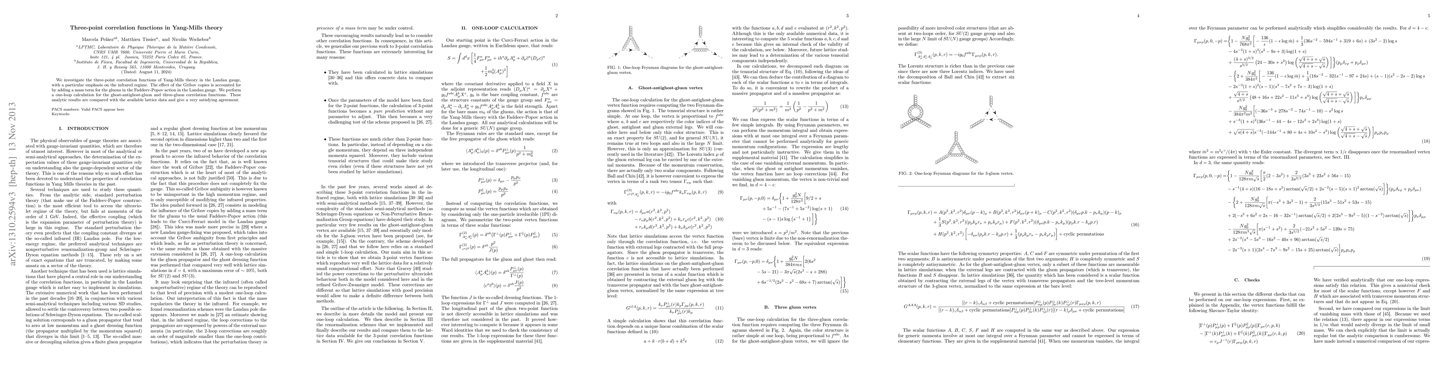 This research investigates three-point correlation functions in Yang-Mills theory, focusing on the infrared regime and including the effects of Gribov copies through a mass term in the Landau gauge. A one-loop calculation of the ghost-antighost-gluon and three-gluon functions shows good agreement with lattice data.