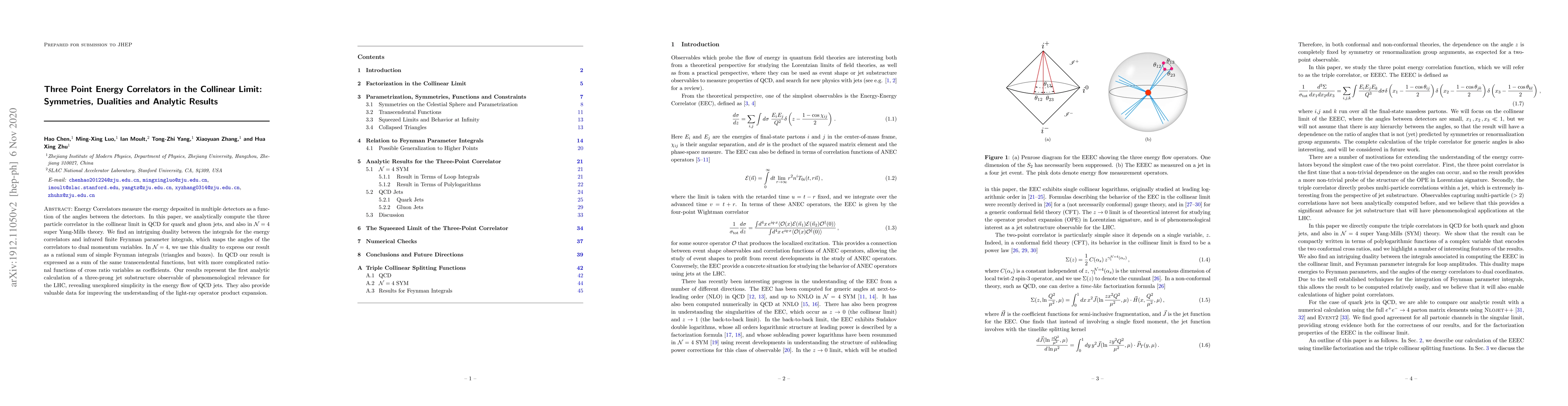Energy Correlators measure the energy deposited in multiple detectors as a function of the angles between the detectors. In this paper, we analytically compute the three particle correlator in the collinear limit in QCD for quark and gluon jets, and also in $\mathcal{N}=4$ super Yang-Mills theory. We find an intriguing duality between the integrals for the energy correlators and infrared finite Feynman parameter integrals, which maps the angles of the correlators to dual momentum variables. In $\mathcal{N}=4$, we use this duality to express our result as a rational sum of simple Feynman integrals (triangles and boxes). In QCD our result is expressed as a sum of the same transcendental functions, but with more complicated rational functions of cross ratio variables as coefficients. Our results represent the first analytic calculation of a three-prong jet substructure observable of phenomenological relevance for the LHC, revealing unexplored simplicity in the energy flow of QCD jets. They also provide valuable data for improving the understanding of the light-ray operator product expansion.