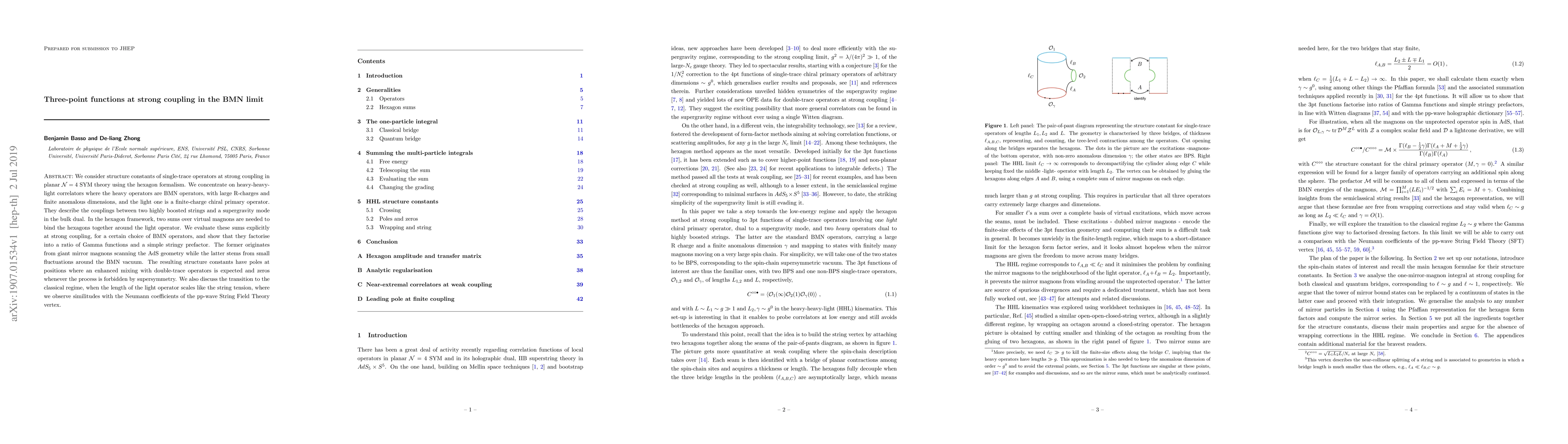 This paper explores the structure constants of single-trace operators in planar $\mathcal{N}=4$ SYM theory at strong coupling, focusing on heavy-heavy-light correlators in the BMN limit. The study reveals that sums over virtual magnons in the hexagon formalism factorize into a ratio of Gamma functions and a stringy prefactor, with implications for couplings between boosted strings and supergravity modes.