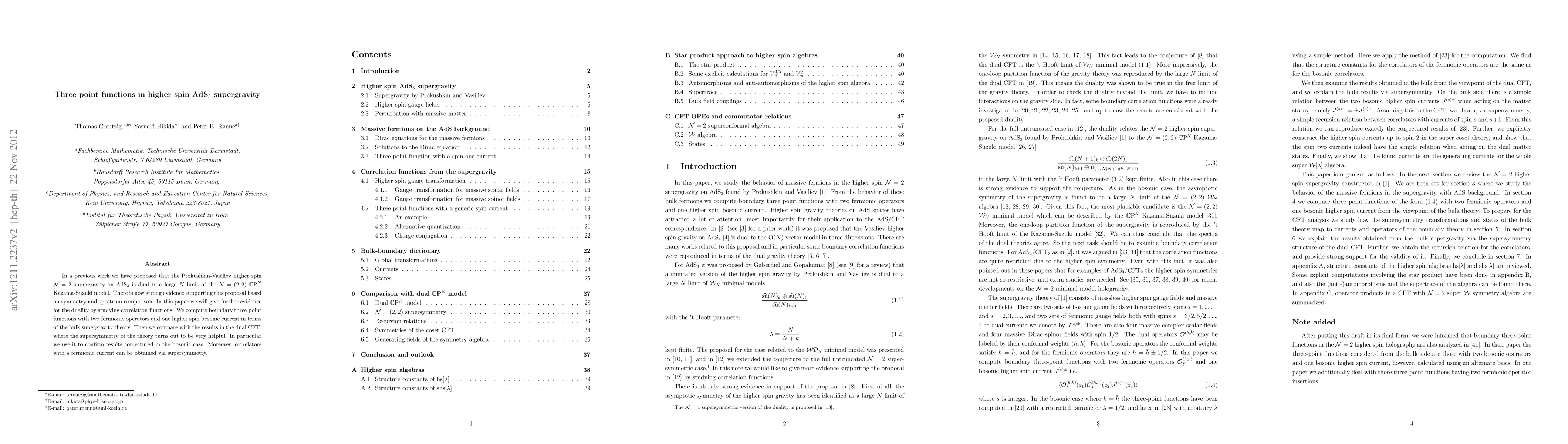 The paper presents a detailed computation of three-point functions in higher spin AdS_3 supergravity and their comparison with the dual CFT, demonstrating the utility of supersymmetry in deriving these results.