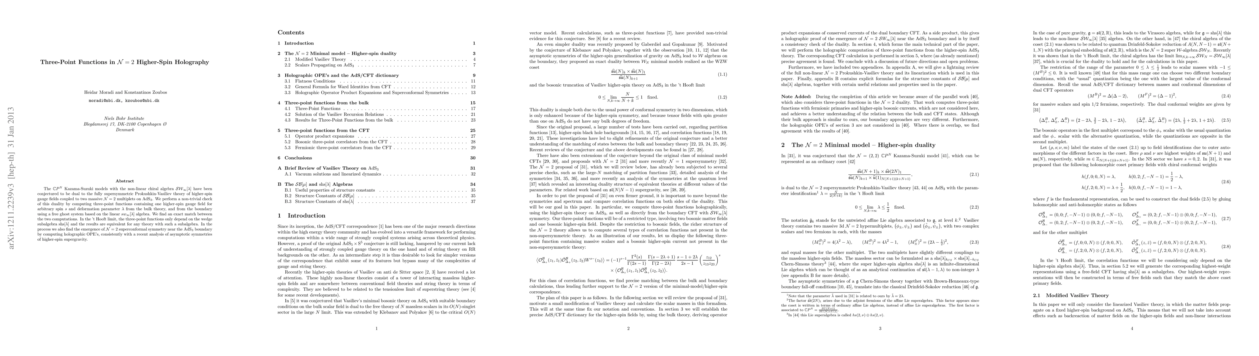 This paper verifies the conjectured duality between CP^N Kazama-Suzuki models and the Prokushkin-Vasiliev theory by matching three-point functions of higher-spin gauge fields computed from both bulk and boundary theories. The results confirm the equivalence in the 't Hooft limit and reveal the emergence of N=2 superconformal symmetry near the AdS_3 boundary.