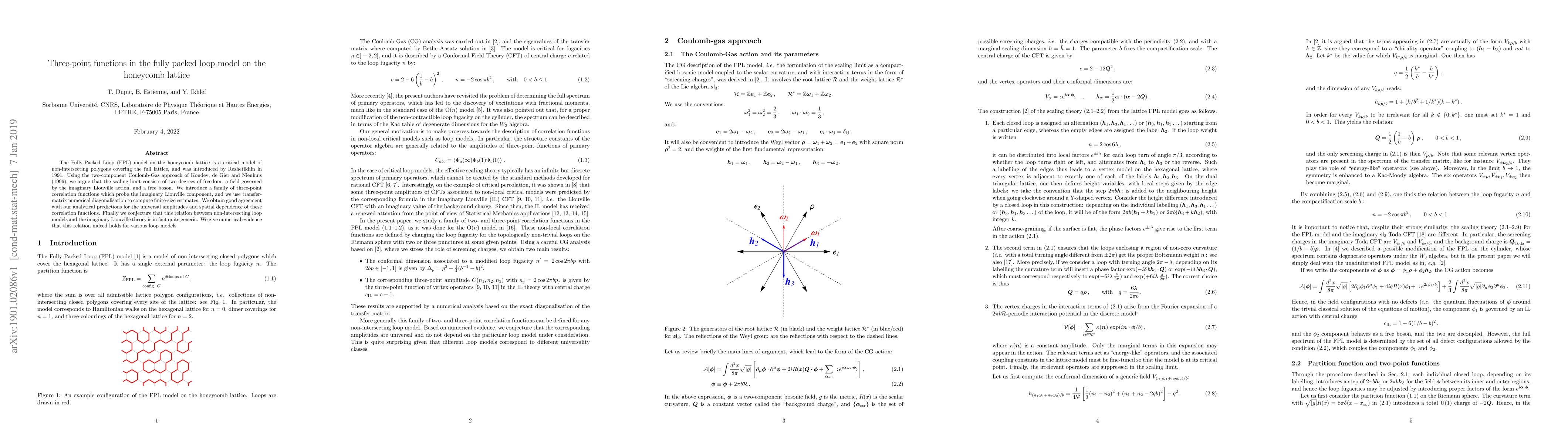 Researchers studied the Fully-Packed Loop model on a honeycomb lattice, finding that its scaling limit consists of two degrees of freedom: an imaginary Liouville field and a free boson, with good agreement between numerical and analytical predictions for three-point correlation functions.