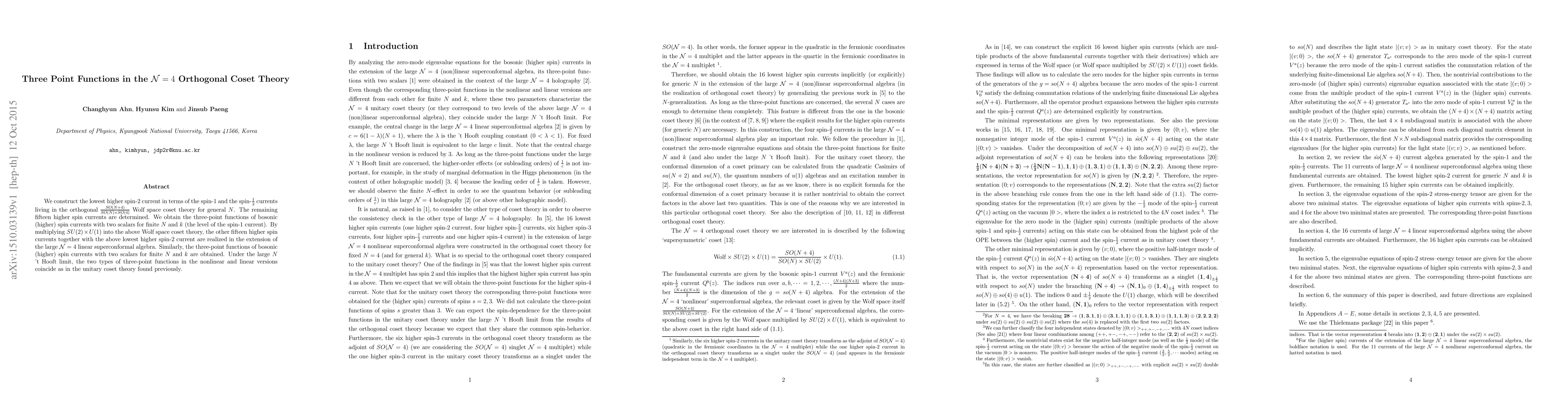 This paper constructs the lowest higher spin-2 current in the N=4 orthogonal coset theory and determines the remaining fifteen higher spin currents. It derives three-point functions for bosonic spin currents with two scalars, showing convergence under the large N 't Hooft limit to previously found unitary coset theory results.