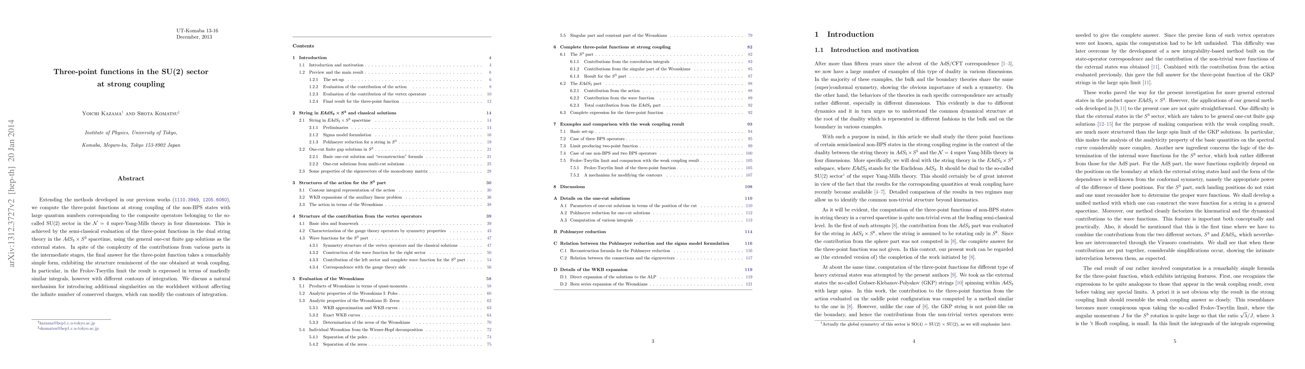 Extending the methods developed in our previous works (arXiv:1110.3949, arXiv:1205.6060), we compute the three-point functions at strong coupling of the non-BPS states with large quantum numbers corresponding to the composite operators belonging to the so-called SU(2) sector in the $\mathcal{N}=4$ super-Yang-Mills theory in four dimensions. This is achieved by the semi-classical evaluation of the three-point functions in the dual string theory in the $AdS_3 \times S^3$ spacetime, using the general one-cut finite gap solutions as the external states. In spite of the complexity of the contributions from various parts in the intermediate stages, the final answer for the three-point function takes a remarkably simple form, exhibiting the structure reminiscent of the one obtained at weak coupling. In particular, in the Frolov-Tseytlin limit the result is expressed in terms of markedly similar integrals, however with different contours of integration. We discuss a natural mechanism for introducing additional singularities on the worldsheet without affecting the infinite number of conserved charges, which can modify the contours of integration.