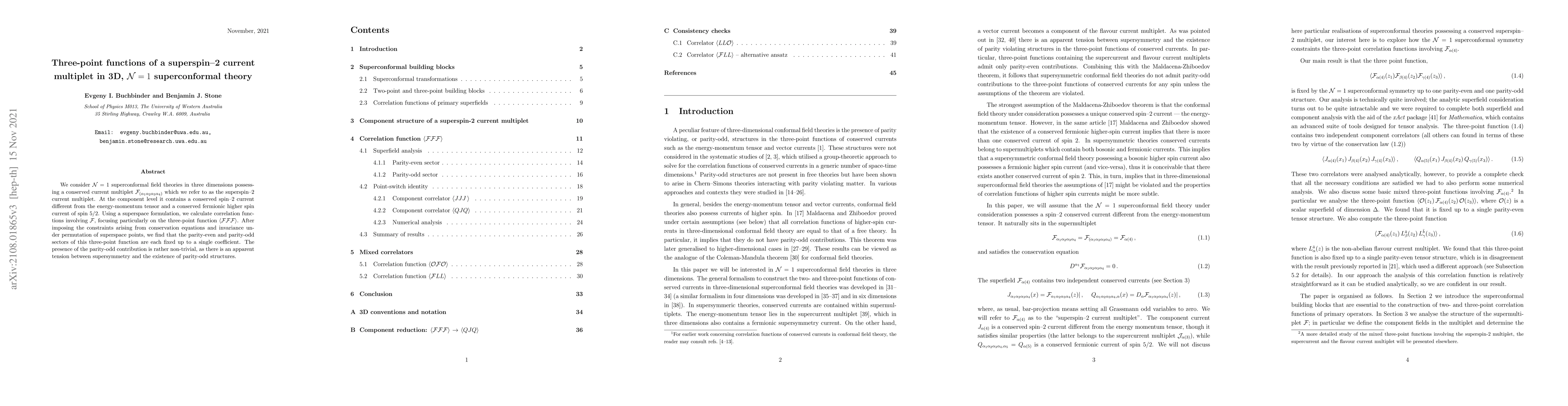 This paper investigates three-point functions of a superspin-2 current multiplet in 3D $\mathcal{N=1}$ superconformal field theories, revealing that the three-point function $\langle \mathcal{F} \mathcal{F} \mathcal{F} \rangle$ is fixed up to a single coefficient in both parity-even and parity-odd sectors. The study highlights the non-trivial presence of parity-odd contributions despite apparent tensions with supersymmetry.