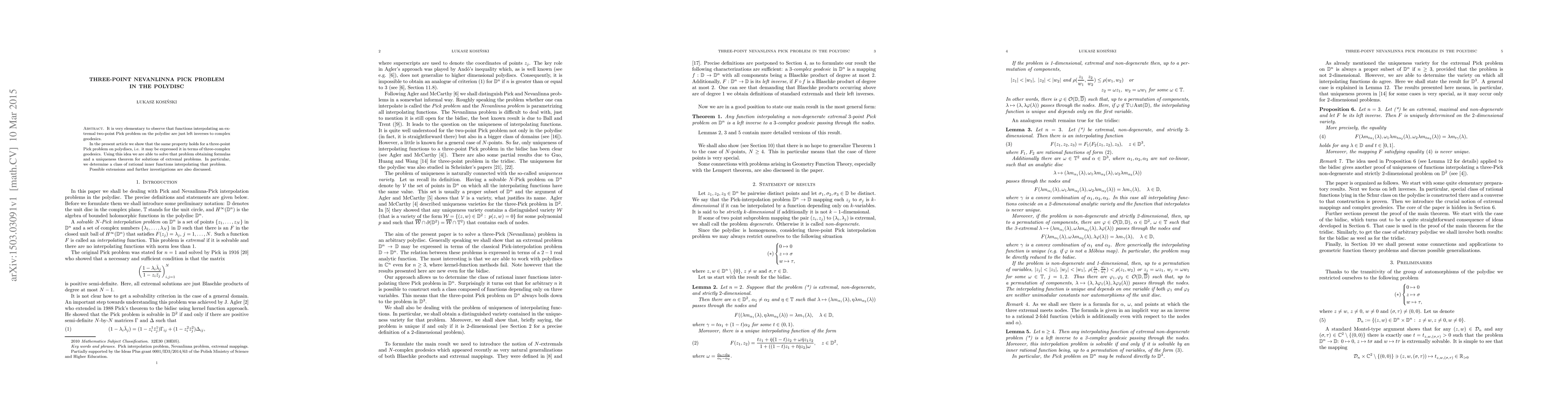 This paper solves the three-point Nevanlinna-Pick interpolation problem in the polydisc by expressing it in terms of three-complex geodesics, leading to formulas and a uniqueness theorem for extremal problem solutions. It also identifies a class of rational inner functions that interpolate these solutions.