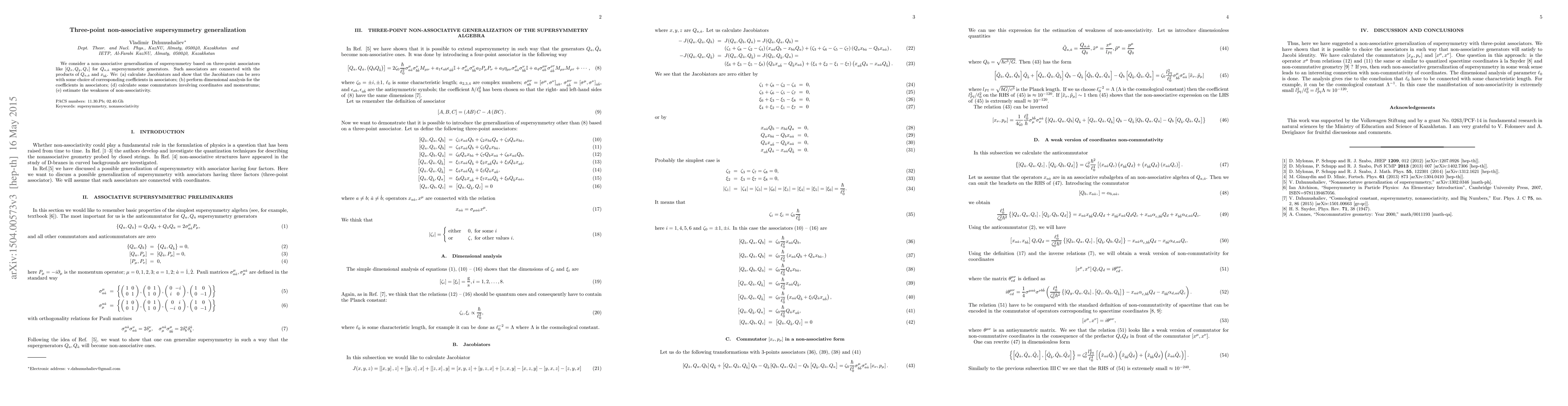 We consider a non-associative generalization of supersymmetry based on three-point associators like $\left[ Q_x, Q_y, Q_z \right]$ for $Q_{a, \dot a}$ supersymmetric generators. Such associators are connected with the products of $Q_{a, \dot a}$ and $x_{b \dot b}$. We: (a) calculate Jacobiators and show that the Jacobiators can be zero with some choice of corresponding coefficients in associators; (b) perform dimensional analysis for the coefficients in associators; (d) calculate some commutators involving coordinates and momentums; (e) estimate the weakness of non-associativity.
