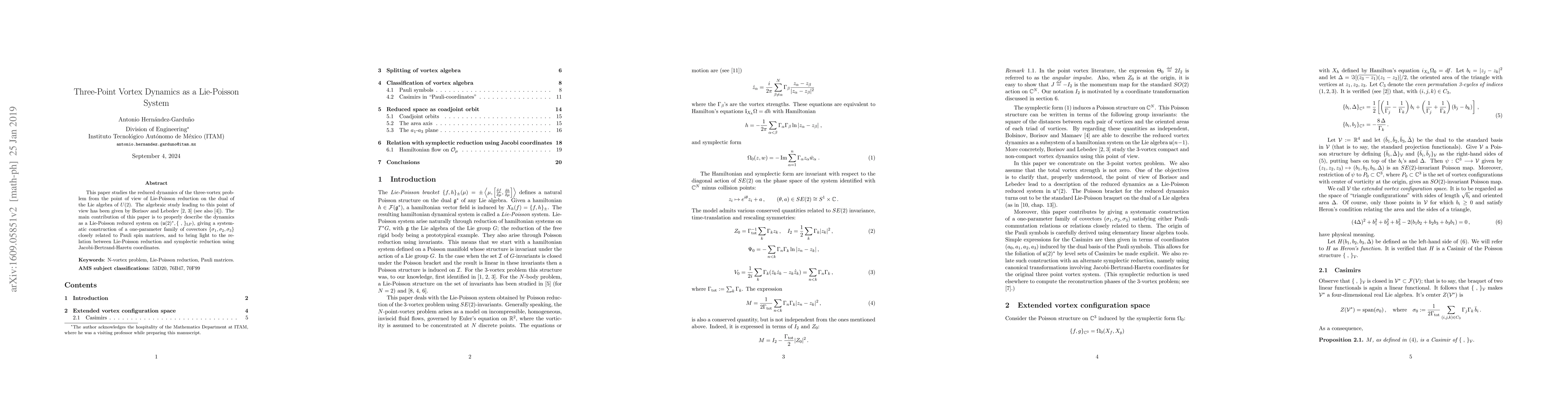 This paper explores the reduced dynamics of the three-vortex problem through Lie-Poisson reduction on the dual of the Lie algebra of $U(2)$, constructing a one-parameter family of covectors related to Pauli spin matrices and clarifying the relationship between Lie-Poisson and symplectic reduction.