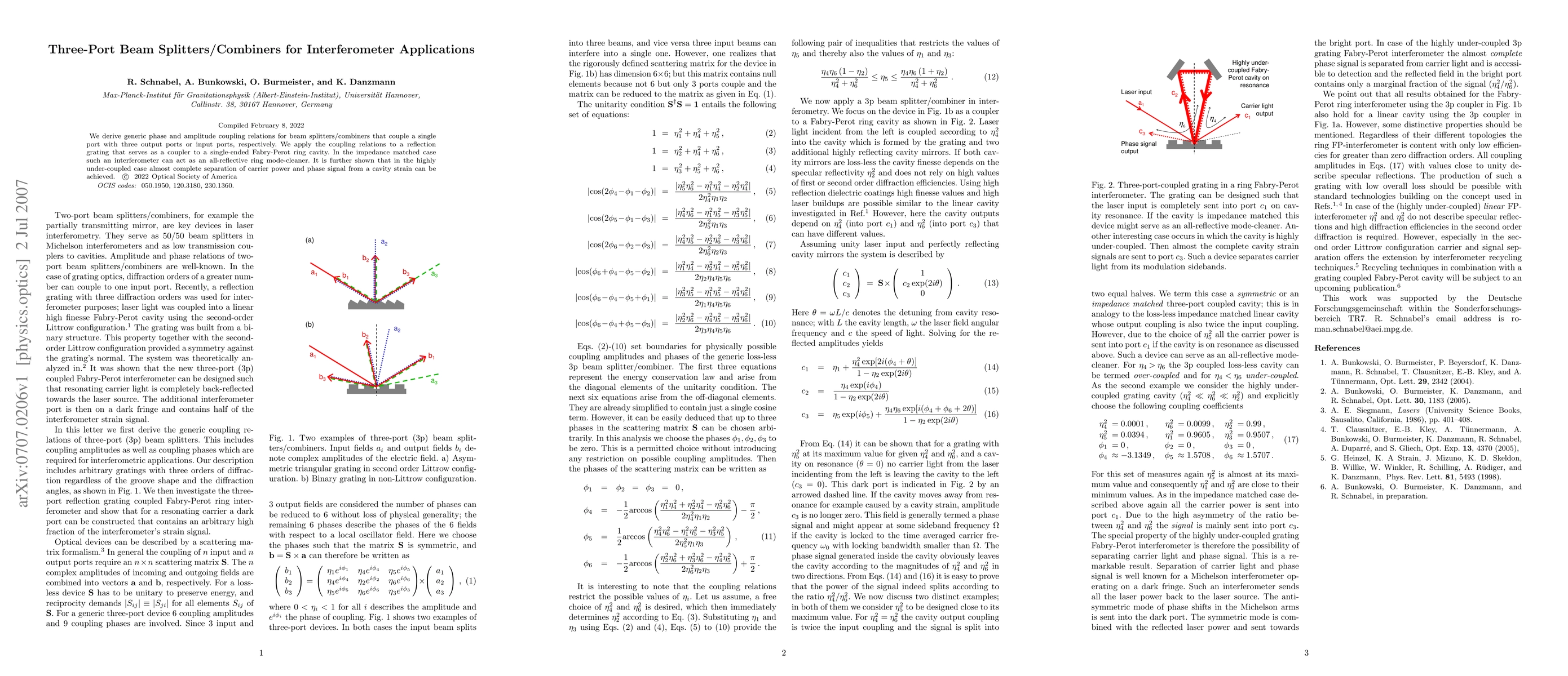 This paper presents phase and amplitude coupling relations for three-port beam splitters-combiners, applying them to a reflection grating in a Fabry-Perot ring cavity interferometer. The interferometer can function as an all-reflective ring mode cleaner and achieves nearly complete separation of carrier power and phase signal from cavity strain in undercoupled conditions.