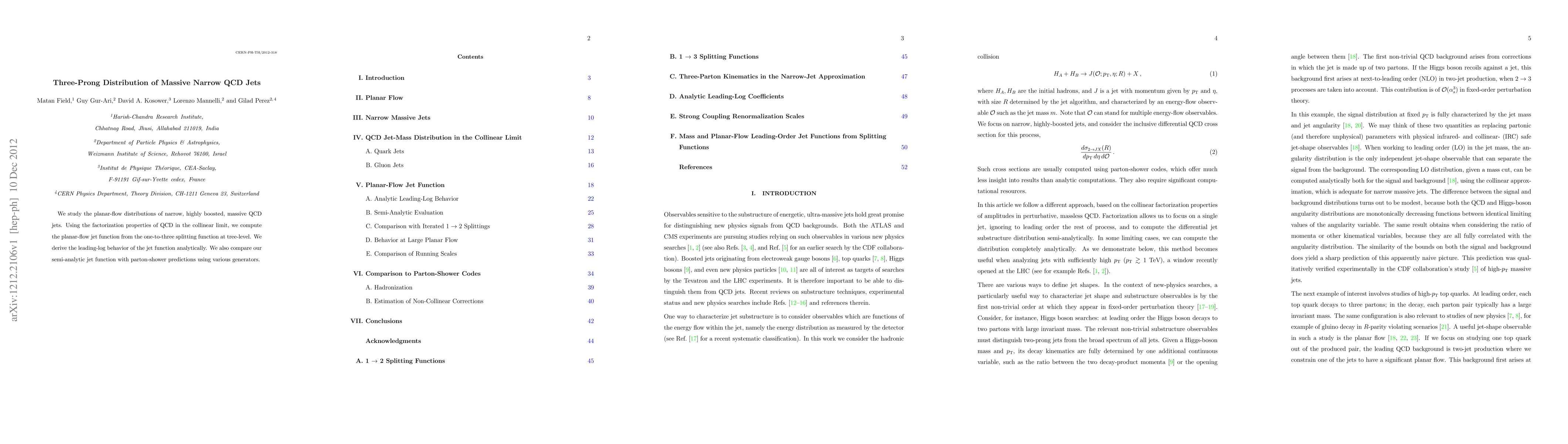 We study the planar-flow distributions of narrow, highly boosted, massive QCD jets. Using the factorization properties of QCD in the collinear limit, we compute the planar-flow jet function from the one-to-three splitting function at tree-level. We derive the leading-log behavior of the jet function analytically. We also compare our semi-analytic jet function with parton-shower predictions using various generators.