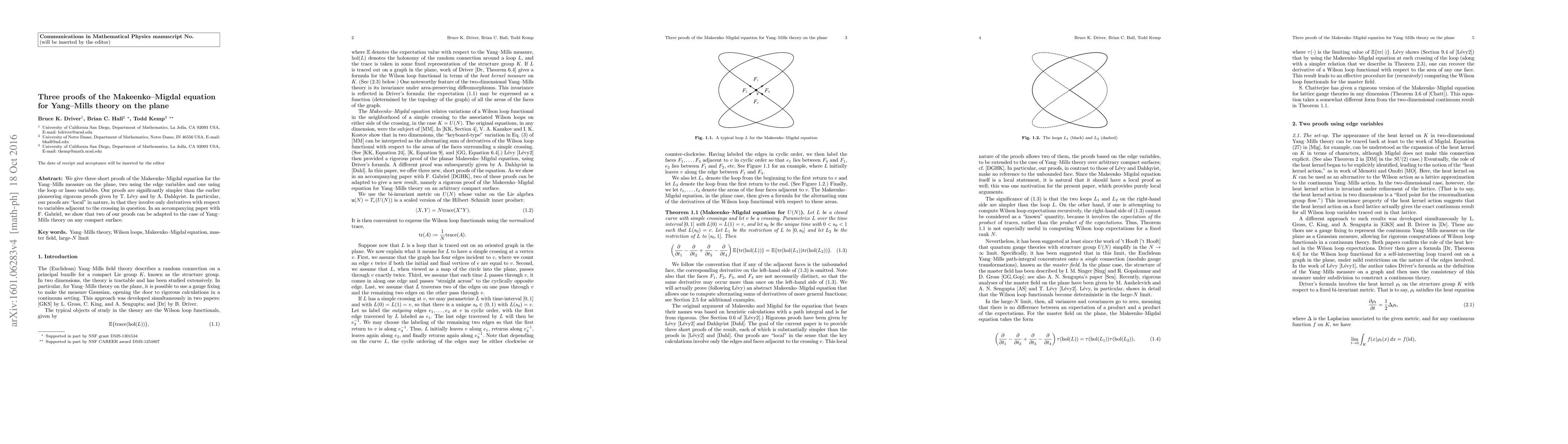 We give three short proofs of the Makeenko-Migdal equation for the Yang-Mills measure on the plane, two using the edge variables and one using the loop or lasso variables. Our proofs are significantly simpler than the earlier pioneering rigorous proofs given by T. L\'evy and by A. Dahlqvist. In particular, our proofs are "local" in nature, in that they involve only derivatives with respect to variables adjacent to the crossing in question. In an accompanying paper with F. Gabriel, we will show that two of our proofs can be adapted to the case of Yang-Mills theory on a compact surface.