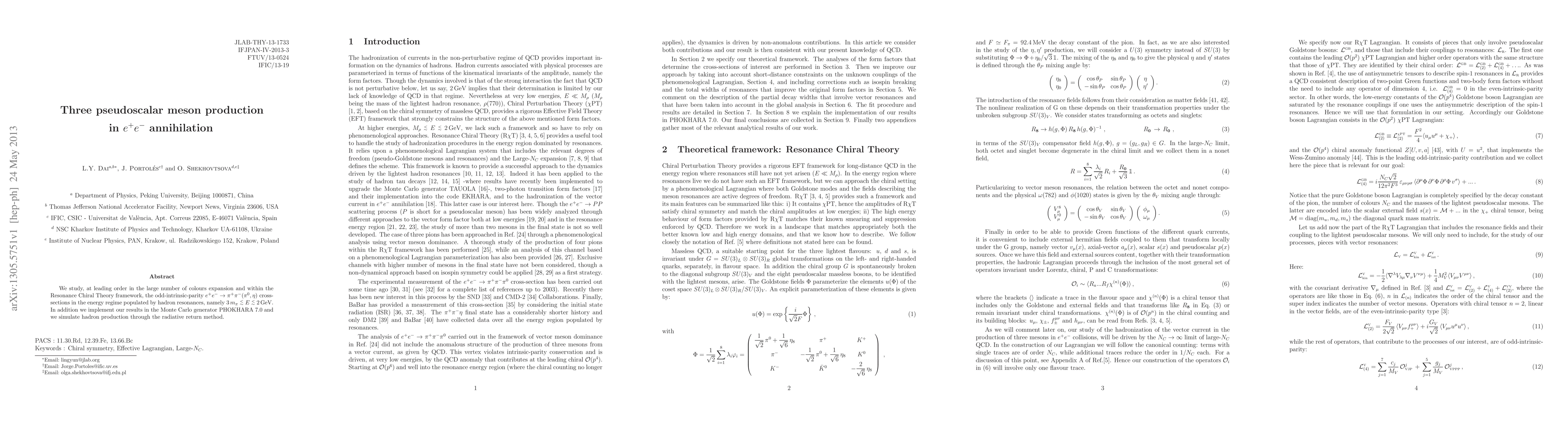 We study, at leading order in the large number of colours expansion and within the Resonance Chiral Theory framework, the odd-intrinsic-parity $e^+ e^- \rightarrow \pi^+ \pi^- (\pi^0, \eta)$ cross-sections in the energy regime populated by hadron resonances, namely $3 \, m_{\pi} \lsim E \lsim 2 \, \mbox{GeV}$. In addition we implement our results in the Monte Carlo generator PHOKHARA 7.0 and we simulate hadron production through the radiative return method.