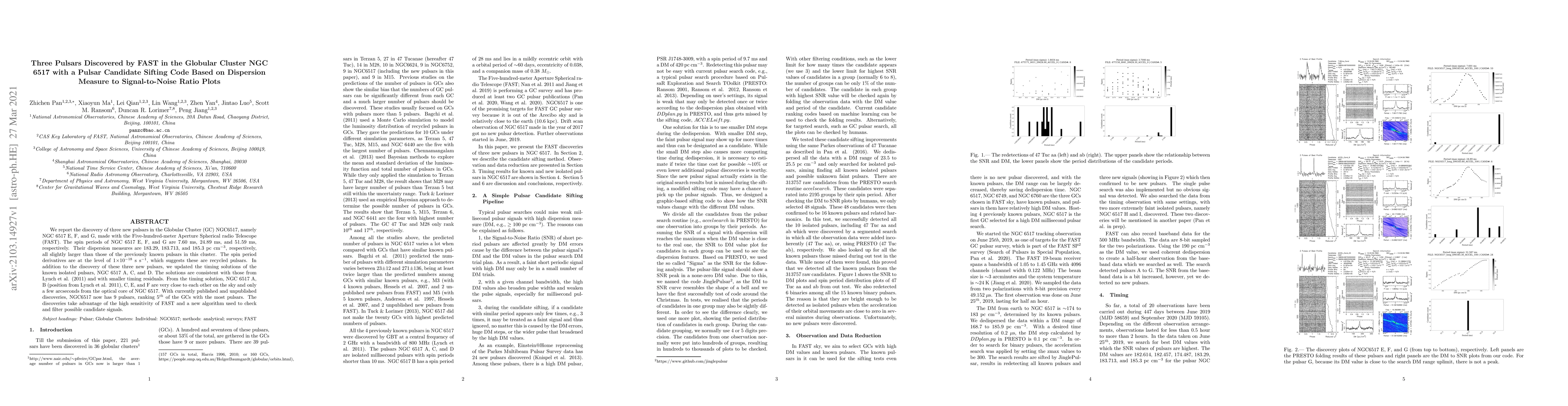 The Five-hundred-meter Aperture Spherical radio Telescope (FAST) discovered three new pulsars in the globular cluster NGC 6517, enhancing its pulsar count to ninth. The new pulsars, NGC 6517 E, F, and G, have spin periods of 7.60 ms, 24.89 ms, and 51.59 ms, respectively, and were identified using a new candidate sifting code based on dispersion measure to signal-to-noise ratio plots.