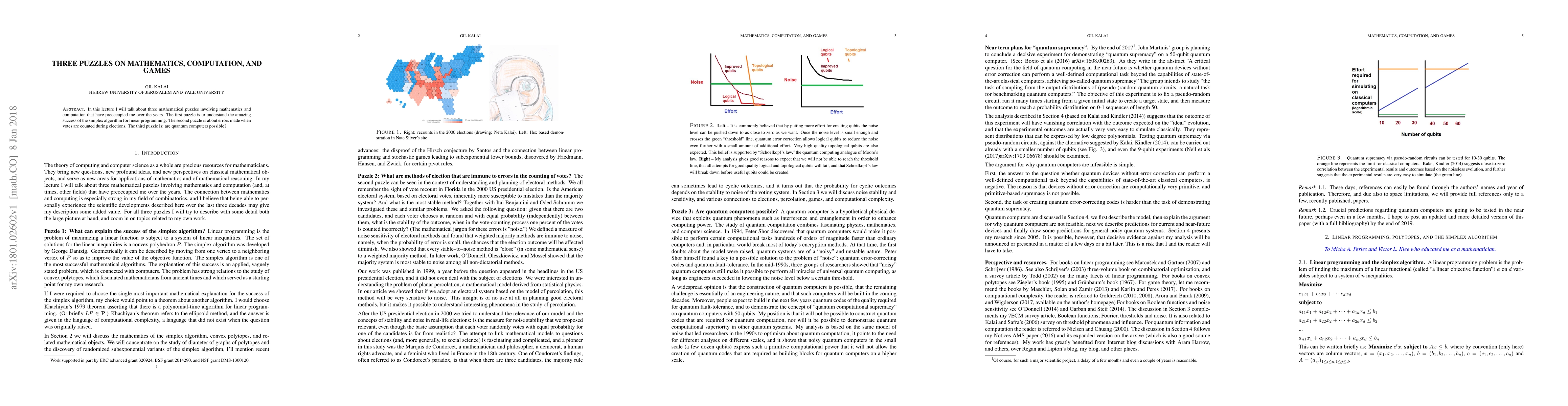 The paper explores three mathematical puzzles: the remarkable efficiency of the simplex algorithm in linear programming, errors in election vote counting, and the feasibility of quantum computers.