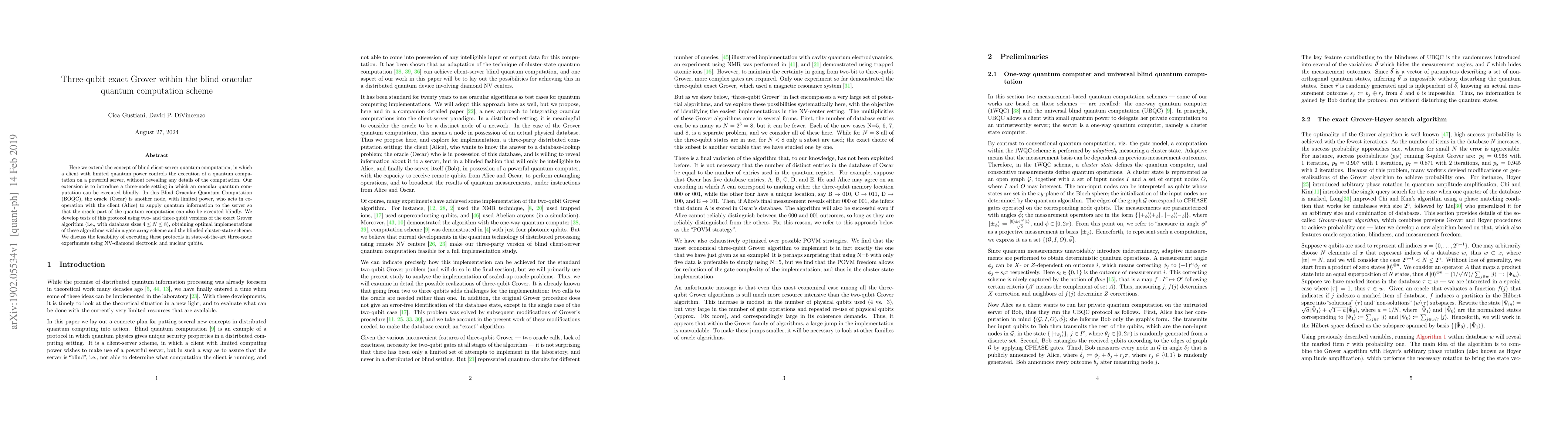 This paper extends the blind client-server quantum computation framework to a three-node setting, introducing a Blind Oracular Quantum Computation (BOQC) scheme. It develops optimal implementations of two- and three-qubit exact Grover algorithms within gate array and blinded cluster-state schemes, demonstrating feasibility for execution in current three-node quantum experiments.