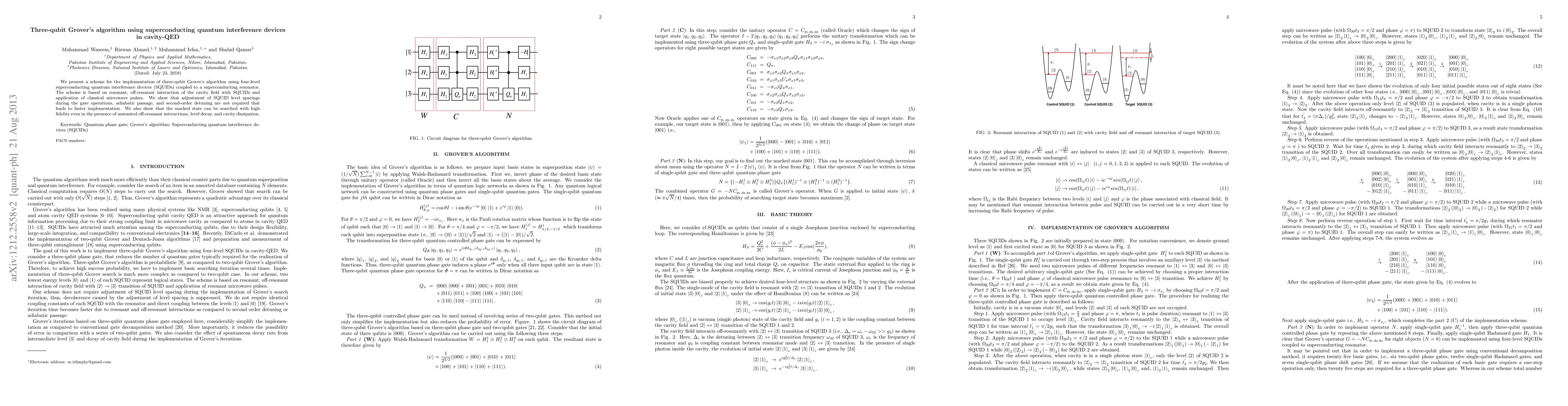 This paper proposes a scheme for executing a three-qubit Grover's algorithm using superconducting quantum interference devices (SQUIDs) in a cavity quantum electrodynamics setup, demonstrating faster implementation without requiring adiabatic passage or second-order detuning, and maintaining high fidelity despite decay and cavity dissipation.