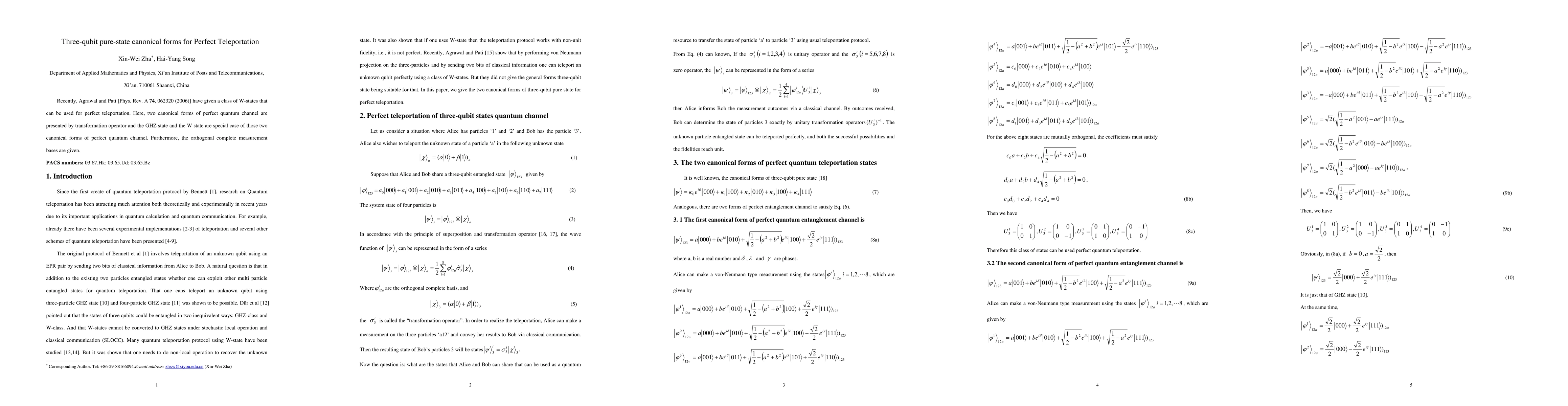 This paper presents two canonical forms of perfect quantum channels for perfect teleportation, showing that the GHZ and W states are special cases. It also provides orthogonal complete measurement bases for these channels.