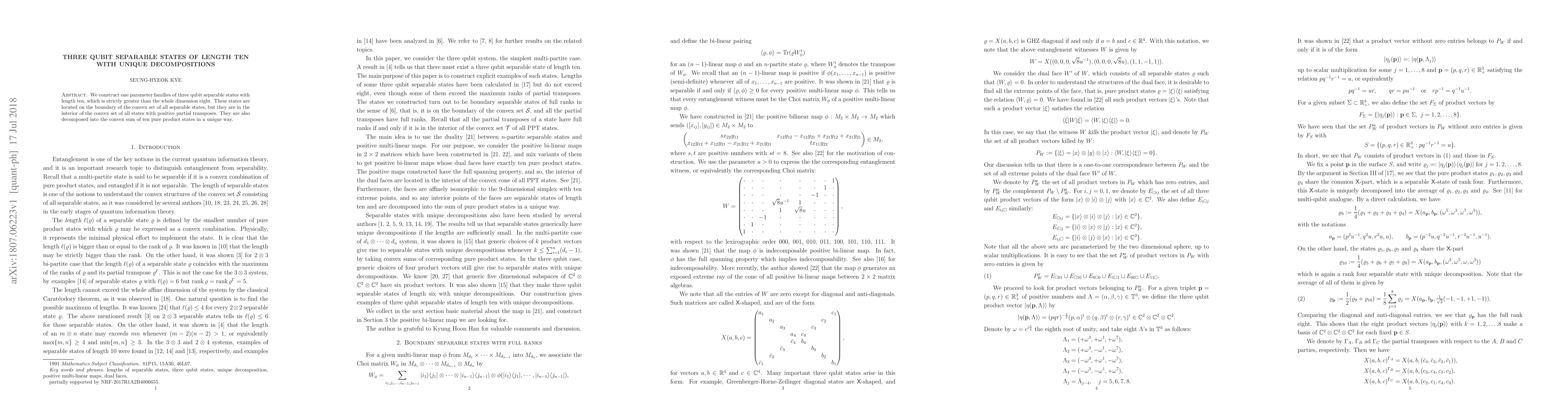 This paper constructs one-parameter families of three-qubit separable states with length ten, uniquely decomposed into a convex sum of ten pure product states. These states lie on the boundary of separable states but inside the set of states with positive partial transposes.