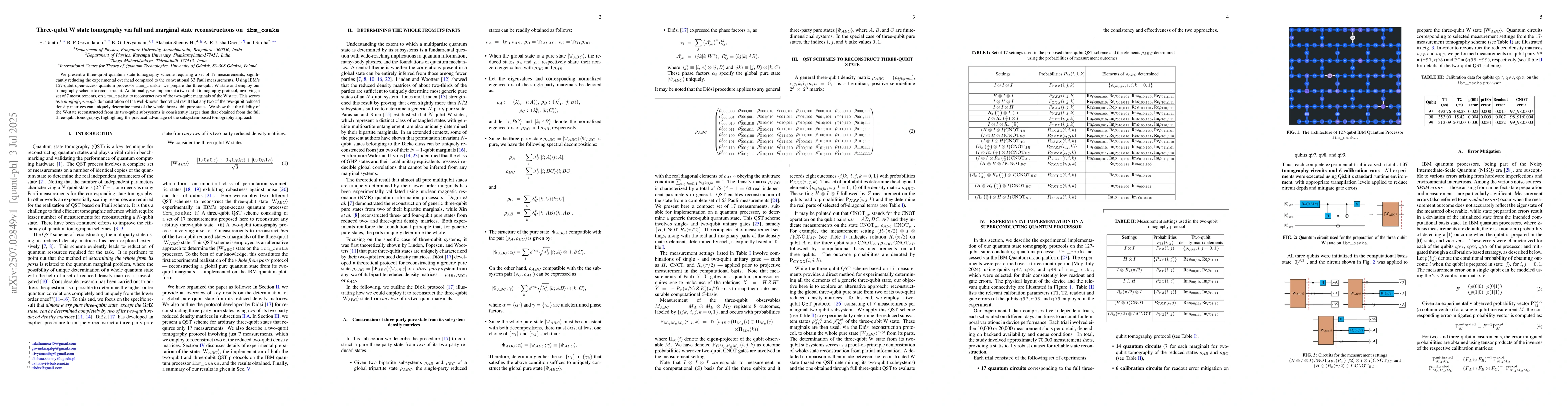 We present a three-qubit quantum state tomography scheme requiring a set of 17 measurements, significantly reducing the experimental overhead compared to the conventional 63 Pauli measurements. Using IBM's 127-qubit open-access quantum processor ibm osaka, we prepare the three-qubit W state and employ our tomography scheme to reconstruct it. Additionally, we implement a two-qubit tomography protocol, involving a set of 7 measurements, on ibm osaka to reconstruct two of the two-qubit marginals of the W state. This serves as a proof-of-principle demonstration of the well-known theoretical result that any two of the two-qubit reduced density matrices can uniquely determine most of the whole three-qubit pure states. We show that the fidelity of the W-state reconstructed from its two-qubit subsystems is consistently larger than that obtained from the full three-qubit tomography, highlighting the practical advantage of the subsystem-based tomography approach.