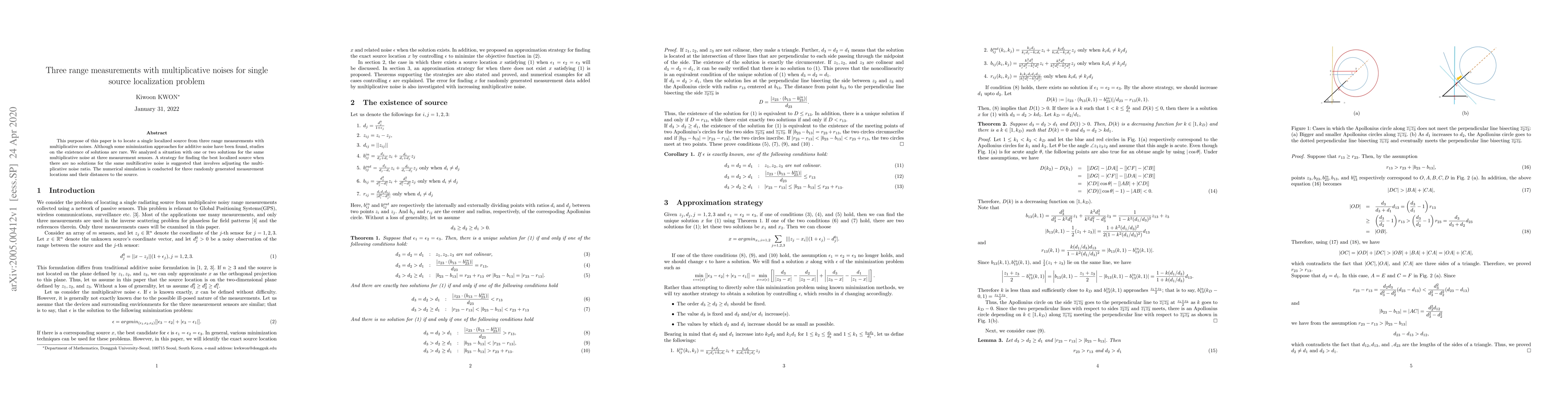 This purpose of this paper is to locate a single localized source from three range measurements with multiplicative noises. Although some minimization approaches for additive noise have been found, studies on the existence of solutions are rare. We analyzed a situation with one or two solutions for the same multiplicative noise at three measurement sensors. A strategy for finding the best localized source when there are no solutions for the same multiplicative noise is suggested that involves adjusting the multiplicative noise ratio. The numerical simulation is conducted for three randomly generated measurement locations and their distances to the source.
