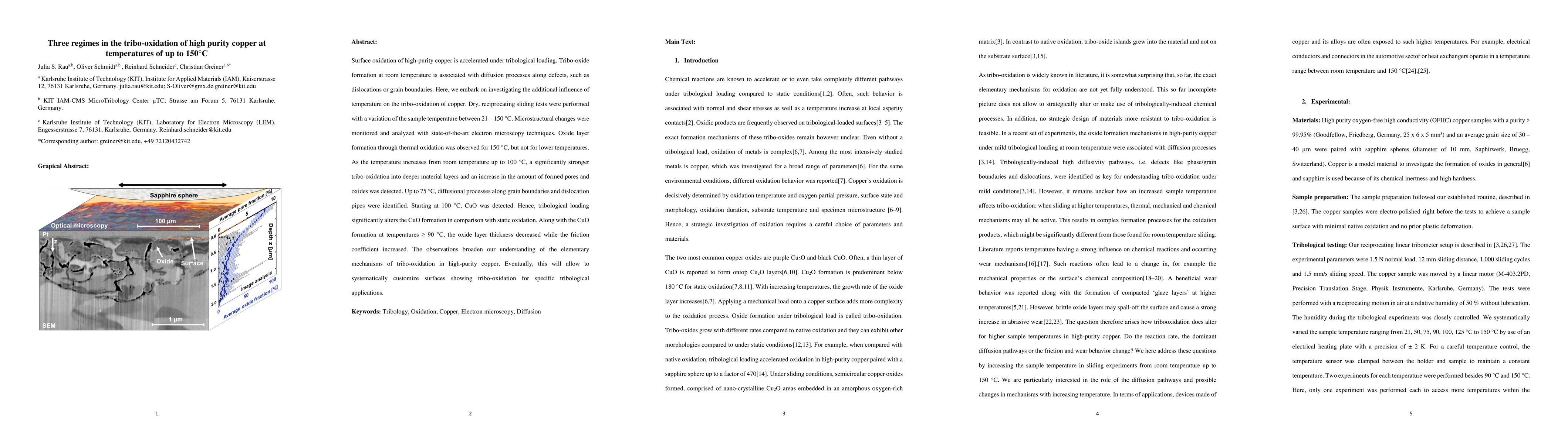 This study investigates the tribo-oxidation of high-purity copper under varying temperatures up to 150 $^\circ$C, revealing three distinct regimes of oxide layer formation and microstructural changes. At temperatures ≥ 90 $^\circ$C, CuO formation and increased friction were observed, indicating significant alterations in oxidation mechanisms compared to static oxidation.