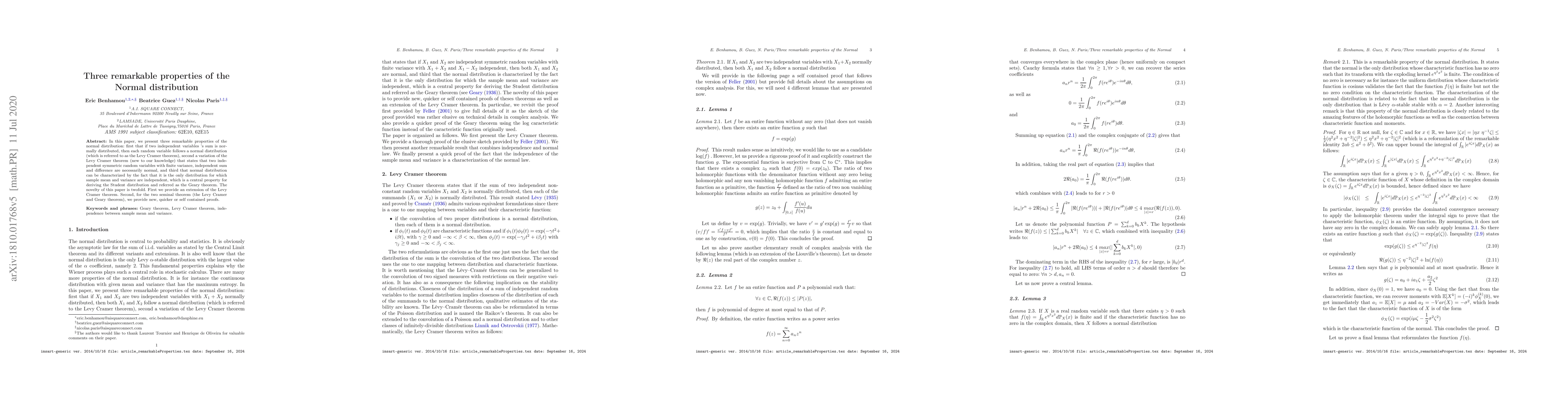 This paper explores three key properties of the normal distribution: the Levy Cramer theorem, a variation of it, and the Geary theorem, offering novel, efficient proofs for each. These properties highlight the uniqueness of the normal distribution in statistical theory.