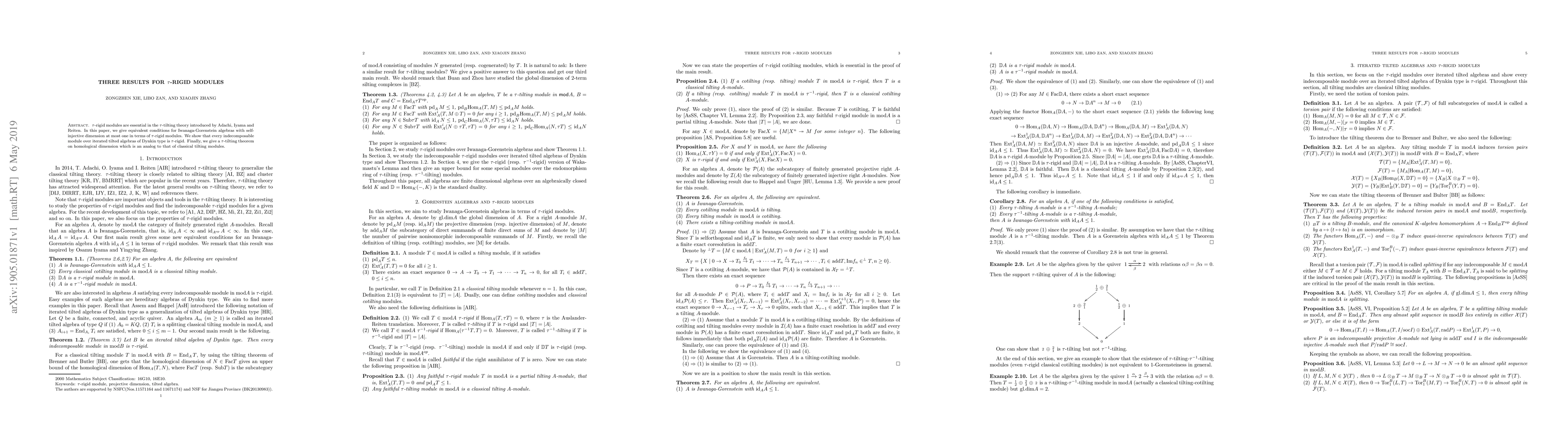 This paper explores $\tau$-rigid modules in $\tau$-tilting theory, proving equivalent conditions for Iwanaga-Gorenstein algebras and demonstrating that every indecomposable module over iterated tilted algebras of Dynkin type is $\tau$-rigid, along with a $\tau$-tilting theorem on homological dimension.