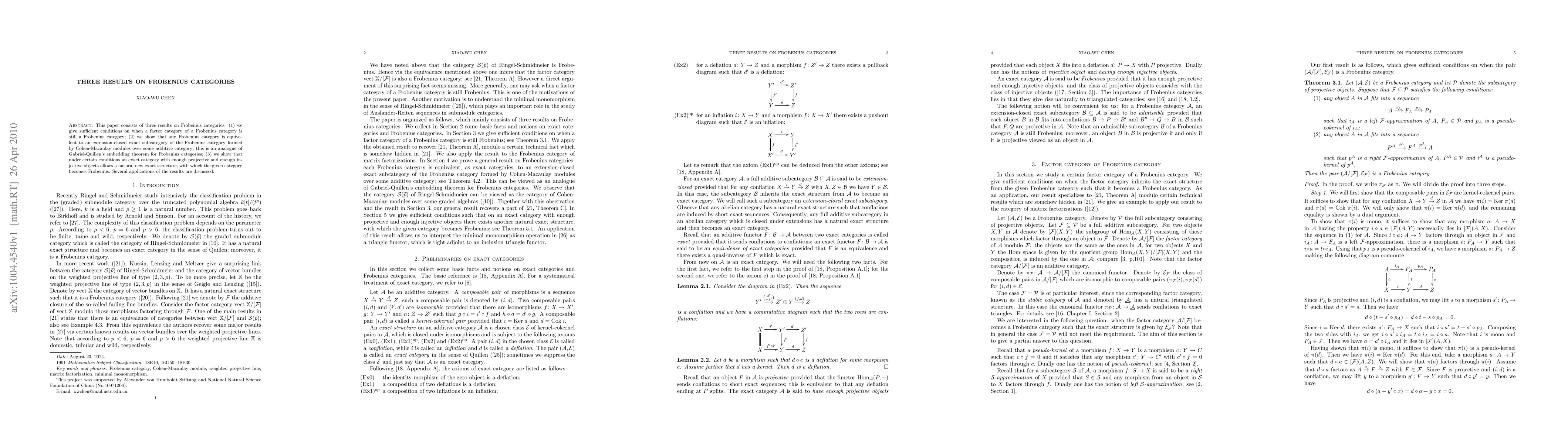 This paper consists of three results on Frobenius categories: (1) we give sufficient conditions on when a factor category of a Frobenius category is still a Frobenius category; (2) we show that any Frobenius category is equivalent to an extension-closed exact subcategory of the Frobenius category formed by Cohen-Macaulay modules over some additive category; this is an analogue of Gabriel-Quillen's embedding theorem for Frobenius categories; (3) we show that under certain conditions an exact category with enough projective and enough injective objects allows a natural new exact structure, with which the given category becomes Frobenius. Several applications of the results are discussed.