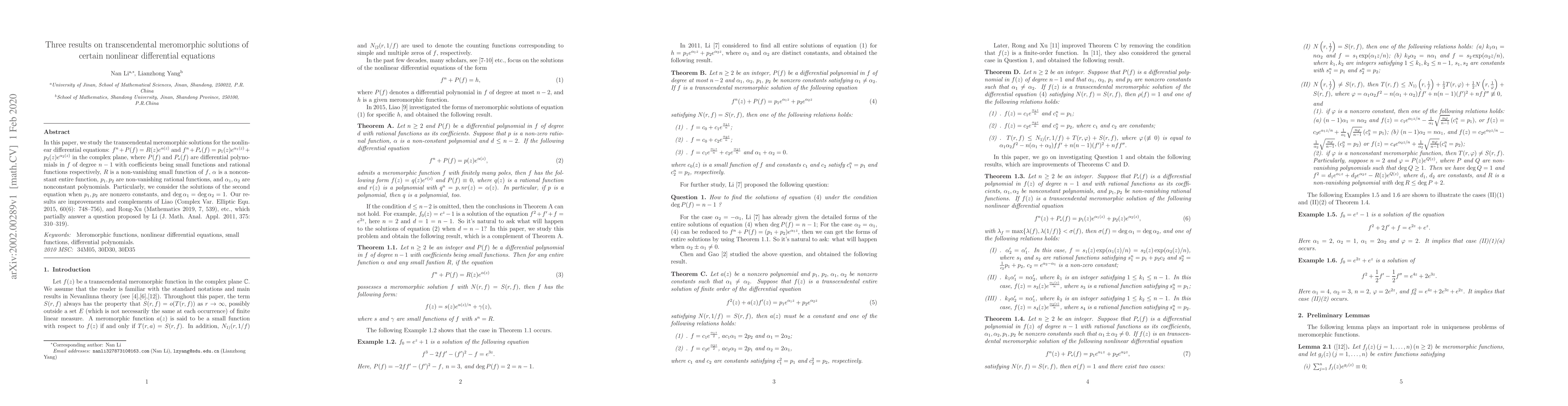 This paper investigates transcendental meromorphic solutions for specific nonlinear differential equations, improving upon previous results by Liao and Rong-Xu. It focuses on equations of the form $f^{n}+P(f)=R(z)e^{\alpha(z)}$ and $f^{n}+P_{*}(f)=p_{1}(z)e^{\alpha_{1}(z)}+p_{2}(z)e^{\alpha_{2}(z)}$, with particular attention to cases where $p_{1}, p_{2}$ are constants and $\alpha_{1}, \alpha_{2}$ are linear polynomials.