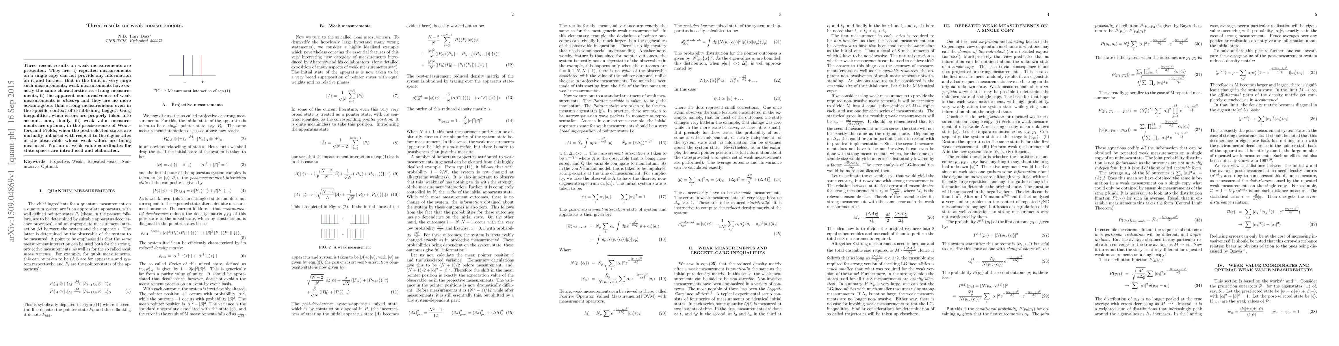 Three recent results on weak measurements are presented. They are: i) repeated measurements on a single copy can not provide any information on it and further, that in the limit of very large such measurements, weak measurements have exactly the same characterstics as strong measurements, ii) the apparent non-invasiveness of weak measurements is \emph{illusory} and they are no more advantageous than strong measurements even in the specific context of establishing Leggett-Garg inequalities, when errors are properly taken into account, and, finally, iii) weak value measurements are optimal, in the precise sense of Wootters and Fields, when the post-selected states are mutually unbiased with respect to the eigenstates of the observable whose weak values are being measured. Notion of weak value coordinates for state spaces are introduced and elaborated.