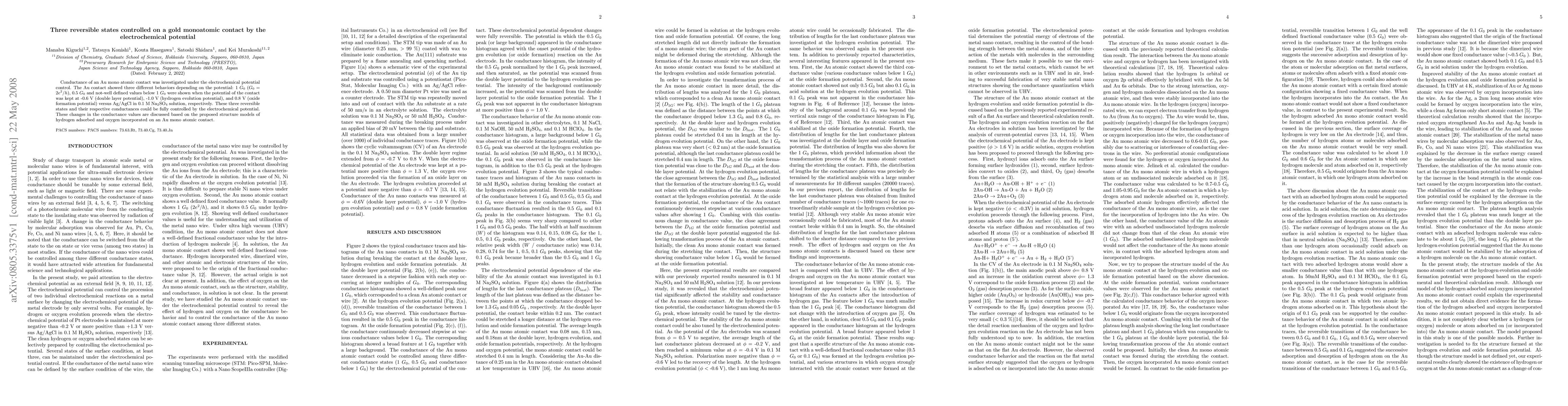 Conductance of an Au mono atomic contact was investigated under the electrochemical potential control. The Au contact showed three different behaviors depending on the potential: 1 $G_{0}$ ($G_{0}$ = $2e^{2}/h$), 0.5 $G_{0}$ and not-well defined values below 1 $G_{0}$ were shown when the potential of the contact was kept at -0.6 V (double layer potential), -1.0 V (hydrogen evolution potential), and 0.8 V (oxide formation potential) versus Ag/AgCl in 0.1 M Na$_{2}$SO$_{4}$ solution, respectively. These three reversible states and their respective conductances could be fully controlled by the electrochemical potential. These changes in the conductance values are discussed based on the proposed structure models of hydrogen adsorbed and oxygen incorporated on an Au mono atomic contact.