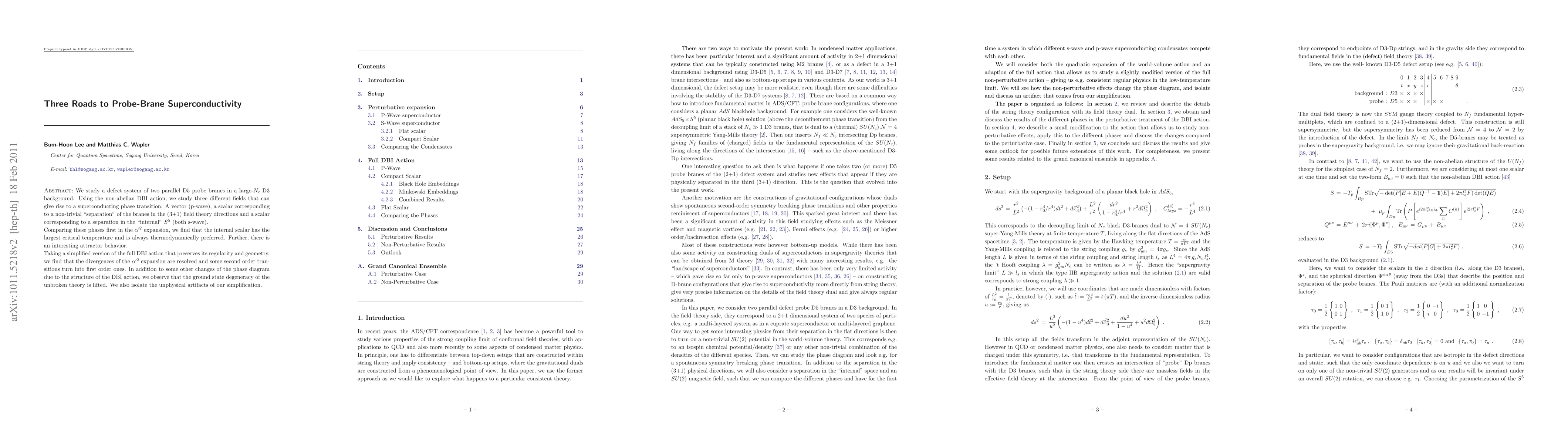 We study a defect system of two parallel D5 probe branes in a large-N_c D3 background. Using the non-abelian DBI action, we study three different fields that can give rise to a superconducting phase transition: A vector (p-wave), a scalar corresponding to a non-trivial "separation"' of the branes in the (3+1) field theory directions and a scalar corresponding to a separation in the "internal" S^5 (both s-wave). Comparing these phases first in the \alpha'^2 expansion, we find that the internal scalar has the largest critical temperature and is always thermodynamically preferred. Further, there is an interesting attractor behavior. Taking a simplified version of the full DBI action that preserves its regularity and geometry, we find that the divergences of the \alpha'^2 expansion are resolved and some second order transitions turn into first order ones. In addition to some other changes of the phase diagram due to the structure of the DBI action, we observe that the ground state degeneracy of the unbroken theory is lifted. We also isolate the unphysical artifacts of our simplification.