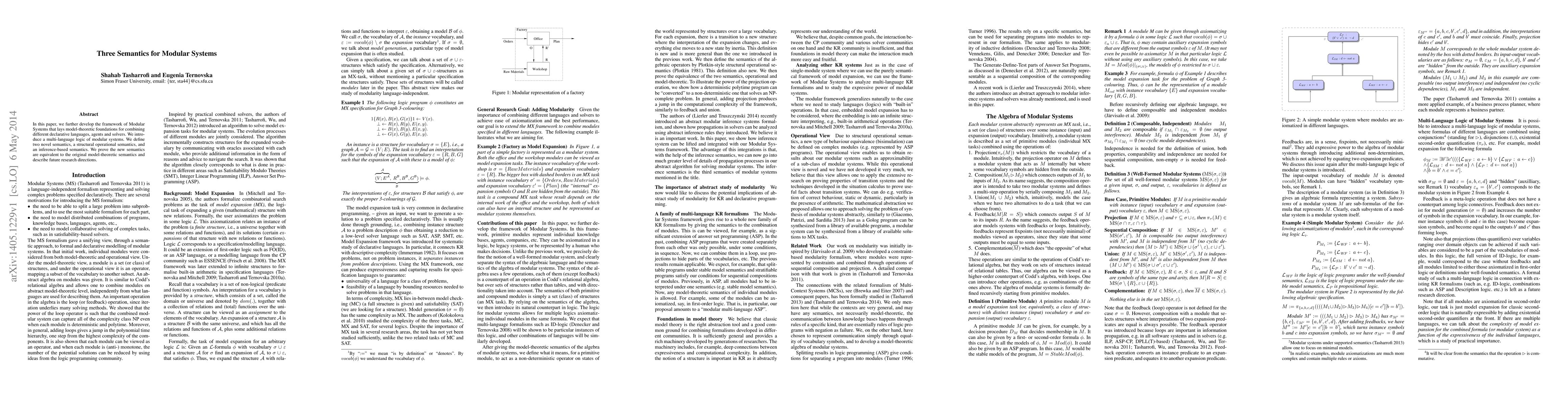 This paper develops a framework for Modular Systems, introducing two novel semantics—structural operational and inference-based—and proving their equivalence to the original model-theoretic semantics. Future research directions are also outlined.