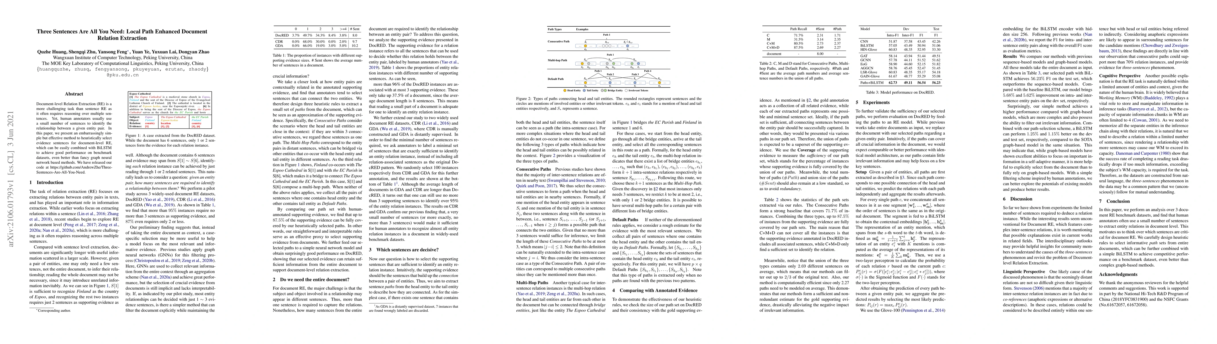 This paper proposes a simple method to select three key sentences for document-level relation extraction, achieving performance comparable to, and sometimes better than, complex graph neural network approaches when combined with BiLSTM. The method is effective and easily implemented, as demonstrated on benchmark datasets.