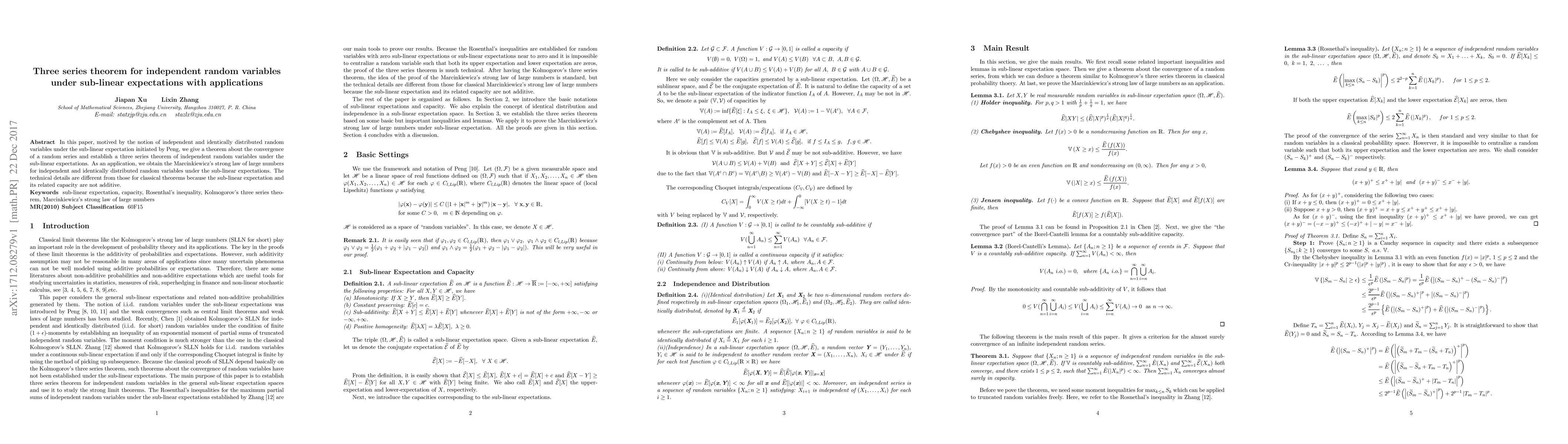 This paper presents a three series theorem for independent random variables under sub-linear expectations, establishing convergence criteria distinct from classical methods due to the non-additivity of sub-linear expectations. An application includes deriving Marcinkiewicz's strong law of large numbers for i.i.d. variables under these expectations.