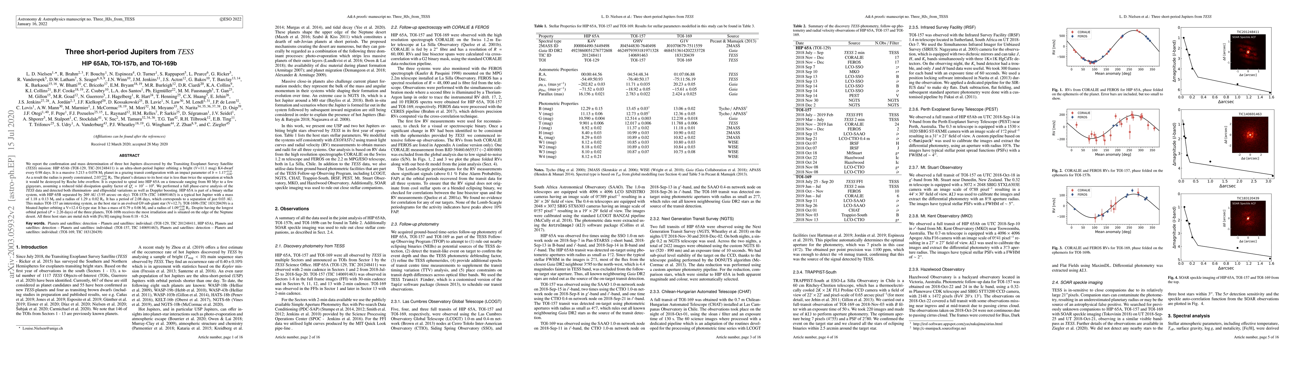 We report the confirmation and mass determination of three hot Jupiters discovered by the Transiting Exoplanet Survey Satellite (TESS) mission: HIP 65Ab (TOI-129, TIC-201248411) is an ultra-short-period Jupiter orbiting a bright (V=11.1 mag) K4-dwarf every 0.98 days. It is a massive 3.213 +/- 0.078 Mjup planet in a grazing transit configuration with an impact parameter of b = 1.17 +0.10/-0.08. As a result the radius is poorly constrained, 2.03 +0.61/-0.49 Rjup. The planet's distance to its host star is less than twice the separation at which it would be destroyed by Roche lobe overflow. It is expected to spiral into HIP 65A on a timescale ranging from 80 Myr to a few gigayears, assuming a reduced tidal dissipation quality factor of Qs' = 10^7 - 10^9. We performed a full phase-curve analysis of the TESS data and detected both illumination- and ellipsoidal variations as well as Doppler boosting. HIP 65A is part of a binary stellar system, with HIP 65B separated by 269 AU (3.95 arcsec on sky). TOI-157b (TIC 140691463) is a typical hot Jupiter with a mass of 1.18 +/- 0.13 Mjup and a radius of 1.29 +/- 0.02 Rjup. It has a period of 2.08 days, which corresponds to a separation of just 0.03 AU. This makes TOI-157 an interesting system, as the host star is an evolved G9 sub-giant star (V=12.7). TOI-169b (TIC 183120439) is a bloated Jupiter orbiting a V=12.4 G-type star. It has a mass of 0.79 +/- 0.06 Mjup and a radius of 1.09 +0.08/-0.05 Rjup. Despite having the longest orbital period (P = 2.26 days) of the three planets, TOI-169b receives the most irradiation and is situated on the edge of the Neptune desert. All three host stars are metal rich with [Fe/H] ranging from 0.18 - 0.24.