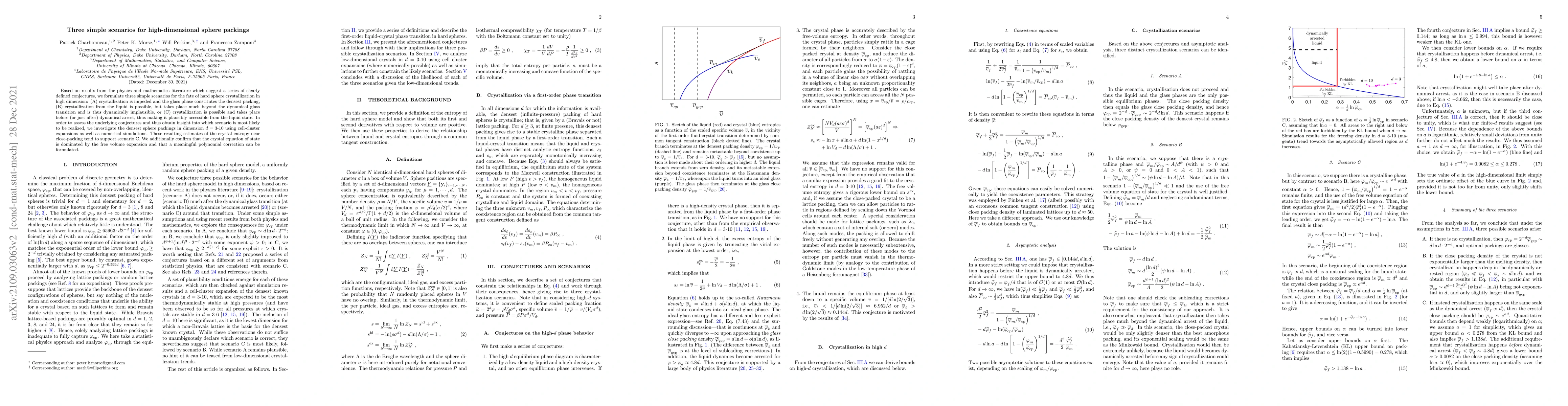 The paper proposes three scenarios for high-dimensional sphere packings, investigating whether crystallization is possible in dimensions 3-10. The study finds that scenario C, where crystallization occurs before or after dynamical arrest, is the most plausible.