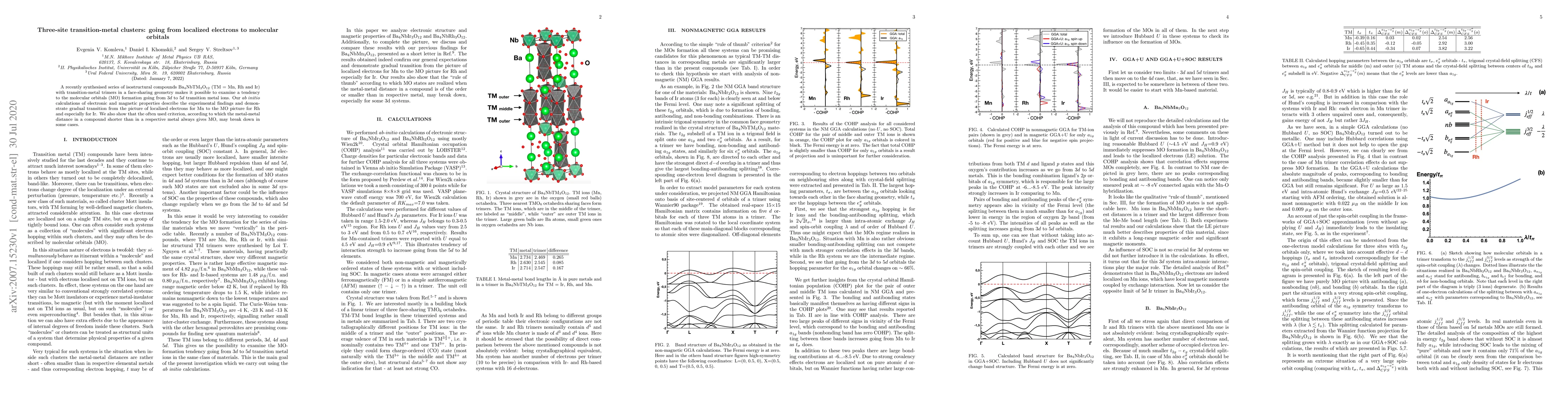 This paper investigates a series of Ba$_4$NbTM$_3$O$_{12}$ compounds with transition-metal trimers, showing a shift from localized electron behavior in Mn to molecular orbital formation in Rh and Ir. The study uses $ab$ $initio$ calculations to support the transition and challenges the conventional metal-metal distance criterion for molecular orbital formation.