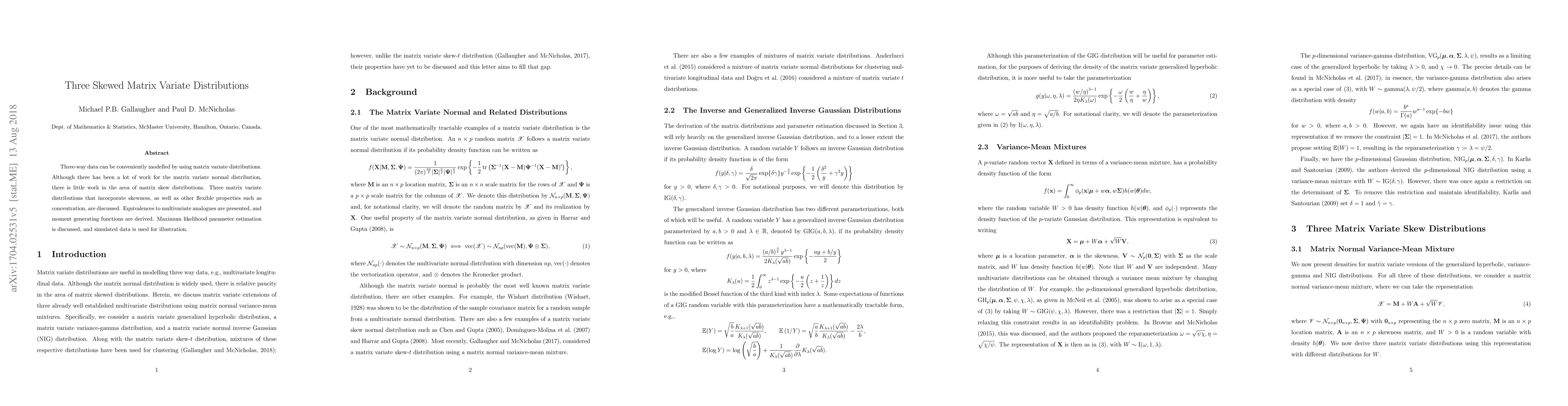 This paper explores three matrix variate distributions that incorporate skewness and concentration properties, drawing equivalences to their multivariate analogues. It also derives moment generating functions and discusses maximum likelihood estimation, illustrated with simulated data.