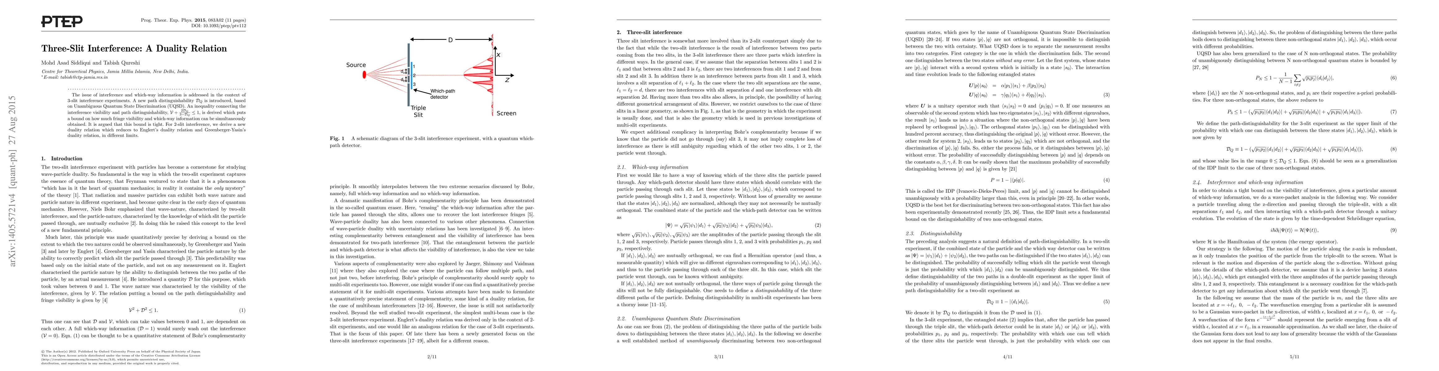 The issue of interference and which-way information is addressed in the context of 3-slit interference experiments. A new path distinguishability ${\mathcal D_Q}$ is introduced, based on Unambiguous Quantum State Discrimination (UQSD). An inequality connecting the interference visibility and path distinguishability, ${\mathcal V} + {2{\mathcal D_Q}\over 3- {\mathcal D_Q}} \le 1$, is derived which puts a bound on how much fringe visibility and which-way information can be simultaneously obtained. It is argued that this bound is tight. For 2-slit interference, we derive a new duality relation which reduces to Englert's duality relation and Greenberger-Yasin's duality relation, in different limits.